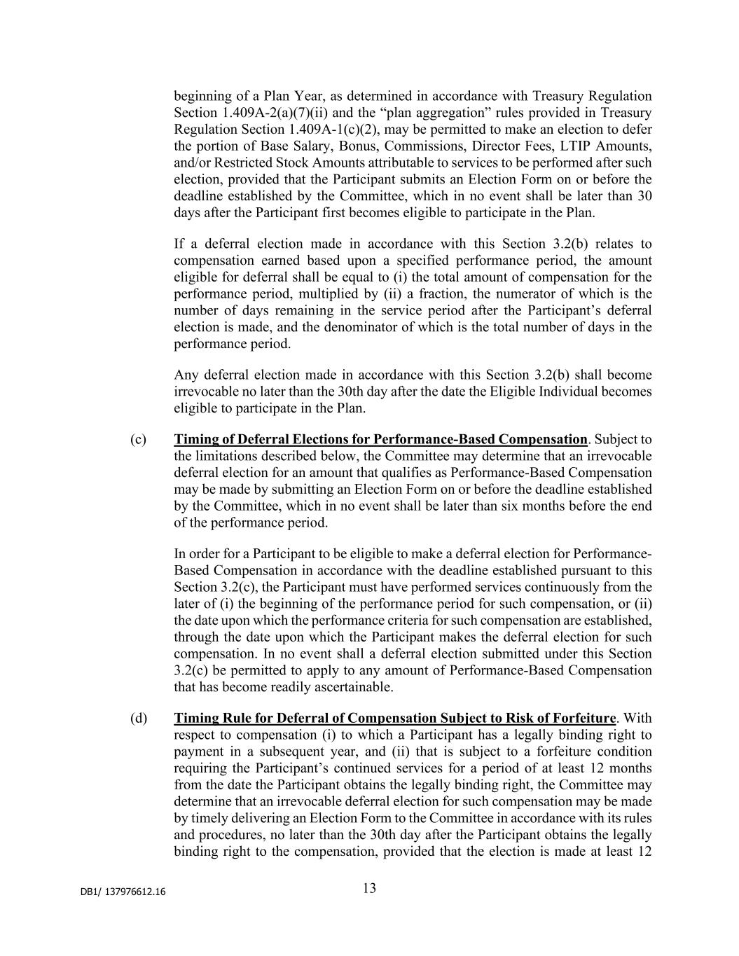 DB1/ 137976612.16 13 beginning of a Plan Year, as determined in accordance with Treasury Regulation Section 1.409A-2(a)(7)(ii) and the “plan aggregation” rules provided in Treasury Regulation Section 1.409A-1(c)(2), may be permitted to make an election to defer the portion of Base Salary, Bonus, Commissions, Director Fees, LTIP Amounts, and/or Restricted Stock Amounts attributable to services to be performed after such election, provided that the Participant submits an Election Form on or before the deadline established by the Committee, which in no event shall be later than 30 days after the Participant first becomes eligible to participate in the Plan. If a deferral election made in accordance with this Section 3.2(b) relates to compensation earned based upon a specified performance period, the amount eligible for deferral shall be equal to (i) the total amount of compensation for the performance period, multiplied by (ii) a fraction, the numerator of which is the number of days remaining in the service period after the Participant’s deferral election is made, and the denominator of which is the total number of days in the performance period. Any deferral election made in accordance with this Section 3.2(b) shall become irrevocable no later than the 30th day after the date the Eligible Individual becomes eligible to participate in the Plan. (c) Timing of Deferral Elections for Performance-Based Compensation. Subject to the limitations described below, the Committee may determine that an irrevocable deferral election for an amount that qualifies as Performance-Based Compensation may be made by submitting an Election Form on or before the deadline established by the Committee, which in no event shall be later than six months before the end of the performance period. In order for a Participant to be eligible to make a deferral election for Performance- Based Compensation in accordance with the deadline established pursuant to this Section 3.2(c), the Participant must have performed services continuously from the later of (i) the beginning of the performance period for such compensation, or (ii) the date upon which the performance criteria for such compensation are established, through the date upon which the Participant makes the deferral election for such compensation. In no event shall a deferral election submitted under this Section 3.2(c) be permitted to apply to any amount of Performance-Based Compensation that has become readily ascertainable. (d) Timing Rule for Deferral of Compensation Subject to Risk of Forfeiture. With respect to compensation (i) to which a Participant has a legally binding right to payment in a subsequent year, and (ii) that is subject to a forfeiture condition requiring the Participant’s continued services for a period of at least 12 months from the date the Participant obtains the legally binding right, the Committee may determine that an irrevocable deferral election for such compensation may be made by timely delivering an Election Form to the Committee in accordance with its rules and procedures, no later than the 30th day after the Participant obtains the legally binding right to the compensation, provided that the election is made at least 12