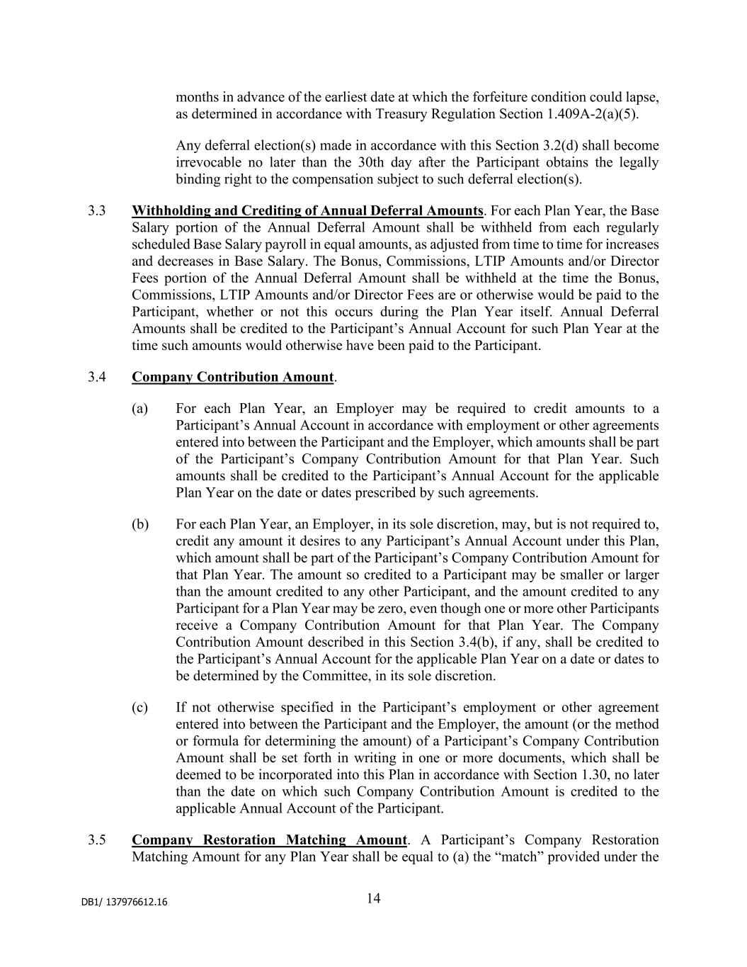 DB1/ 137976612.16 14 months in advance of the earliest date at which the forfeiture condition could lapse, as determined in accordance with Treasury Regulation Section 1.409A-2(a)(5). Any deferral election(s) made in accordance with this Section 3.2(d) shall become irrevocable no later than the 30th day after the Participant obtains the legally binding right to the compensation subject to such deferral election(s). 3.3 Withholding and Crediting of Annual Deferral Amounts. For each Plan Year, the Base Salary portion of the Annual Deferral Amount shall be withheld from each regularly scheduled Base Salary payroll in equal amounts, as adjusted from time to time for increases and decreases in Base Salary. The Bonus, Commissions, LTIP Amounts and/or Director Fees portion of the Annual Deferral Amount shall be withheld at the time the Bonus, Commissions, LTIP Amounts and/or Director Fees are or otherwise would be paid to the Participant, whether or not this occurs during the Plan Year itself. Annual Deferral Amounts shall be credited to the Participant’s Annual Account for such Plan Year at the time such amounts would otherwise have been paid to the Participant. 3.4 Company Contribution Amount. (a) For each Plan Year, an Employer may be required to credit amounts to a Participant’s Annual Account in accordance with employment or other agreements entered into between the Participant and the Employer, which amounts shall be part of the Participant’s Company Contribution Amount for that Plan Year. Such amounts shall be credited to the Participant’s Annual Account for the applicable Plan Year on the date or dates prescribed by such agreements. (b) For each Plan Year, an Employer, in its sole discretion, may, but is not required to, credit any amount it desires to any Participant’s Annual Account under this Plan, which amount shall be part of the Participant’s Company Contribution Amount for that Plan Year. The amount so credited to a Participant may be smaller or larger than the amount credited to any other Participant, and the amount credited to any Participant for a Plan Year may be zero, even though one or more other Participants receive a Company Contribution Amount for that Plan Year. The Company Contribution Amount described in this Section 3.4(b), if any, shall be credited to the Participant’s Annual Account for the applicable Plan Year on a date or dates to be determined by the Committee, in its sole discretion. (c) If not otherwise specified in the Participant’s employment or other agreement entered into between the Participant and the Employer, the amount (or the method or formula for determining the amount) of a Participant’s Company Contribution Amount shall be set forth in writing in one or more documents, which shall be deemed to be incorporated into this Plan in accordance with Section 1.30, no later than the date on which such Company Contribution Amount is credited to the applicable Annual Account of the Participant. 3.5 Company Restoration Matching Amount. A Participant’s Company Restoration Matching Amount for any Plan Year shall be equal to (a) the “match” provided under the