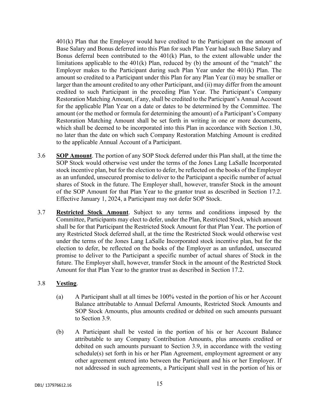 DB1/ 137976612.16 15 401(k) Plan that the Employer would have credited to the Participant on the amount of Base Salary and Bonus deferred into this Plan for such Plan Year had such Base Salary and Bonus deferral been contributed to the 401(k) Plan, to the extent allowable under the limitations applicable to the 401(k) Plan, reduced by (b) the amount of the “match” the Employer makes to the Participant during such Plan Year under the 401(k) Plan. The amount so credited to a Participant under this Plan for any Plan Year (i) may be smaller or larger than the amount credited to any other Participant, and (ii) may differ from the amount credited to such Participant in the preceding Plan Year. The Participant’s Company Restoration Matching Amount, if any, shall be credited to the Participant’s Annual Account for the applicable Plan Year on a date or dates to be determined by the Committee. The amount (or the method or formula for determining the amount) of a Participant’s Company Restoration Matching Amount shall be set forth in writing in one or more documents, which shall be deemed to be incorporated into this Plan in accordance with Section 1.30, no later than the date on which such Company Restoration Matching Amount is credited to the applicable Annual Account of a Participant. 3.6 SOP Amount. The portion of any SOP Stock deferred under this Plan shall, at the time the SOP Stock would otherwise vest under the terms of the Jones Lang LaSalle Incorporated stock incentive plan, but for the election to defer, be reflected on the books of the Employer as an unfunded, unsecured promise to deliver to the Participant a specific number of actual shares of Stock in the future. The Employer shall, however, transfer Stock in the amount of the SOP Amount for that Plan Year to the grantor trust as described in Section 17.2. Effective January 1, 2024, a Participant may not defer SOP Stock. 3.7 Restricted Stock Amount. Subject to any terms and conditions imposed by the Committee, Participants may elect to defer, under the Plan, Restricted Stock, which amount shall be for that Participant the Restricted Stock Amount for that Plan Year. The portion of any Restricted Stock deferred shall, at the time the Restricted Stock would otherwise vest under the terms of the Jones Lang LaSalle Incorporated stock incentive plan, but for the election to defer, be reflected on the books of the Employer as an unfunded, unsecured promise to deliver to the Participant a specific number of actual shares of Stock in the future. The Employer shall, however, transfer Stock in the amount of the Restricted Stock Amount for that Plan Year to the grantor trust as described in Section 17.2. 3.8 Vesting. (a) A Participant shall at all times be 100% vested in the portion of his or her Account Balance attributable to Annual Deferral Amounts, Restricted Stock Amounts and SOP Stock Amounts, plus amounts credited or debited on such amounts pursuant to Section 3.9. (b) A Participant shall be vested in the portion of his or her Account Balance attributable to any Company Contribution Amounts, plus amounts credited or debited on such amounts pursuant to Section 3.9, in accordance with the vesting schedule(s) set forth in his or her Plan Agreement, employment agreement or any other agreement entered into between the Participant and his or her Employer. If not addressed in such agreements, a Participant shall vest in the portion of his or
