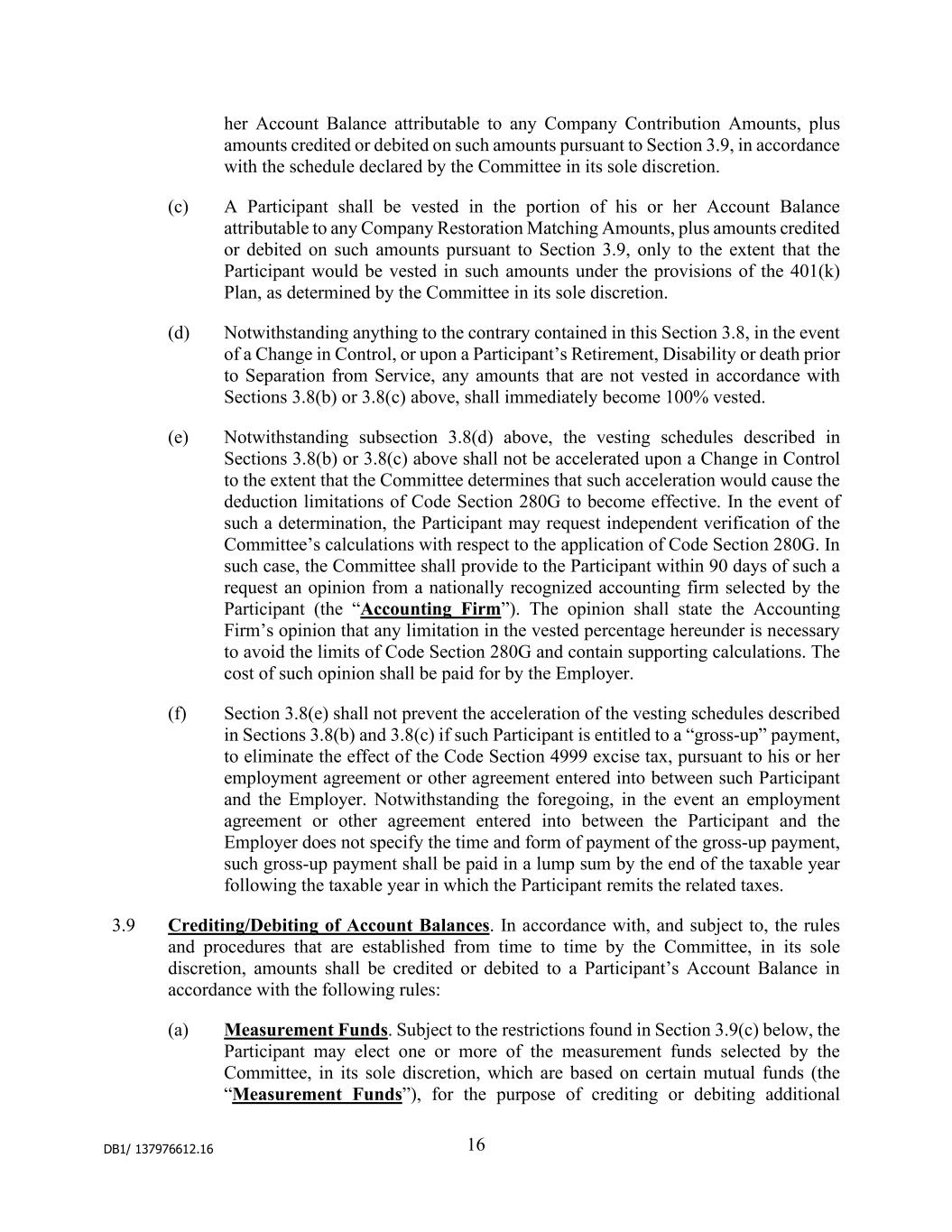 DB1/ 137976612.16 16 her Account Balance attributable to any Company Contribution Amounts, plus amounts credited or debited on such amounts pursuant to Section 3.9, in accordance with the schedule declared by the Committee in its sole discretion. (c) A Participant shall be vested in the portion of his or her Account Balance attributable to any Company Restoration Matching Amounts, plus amounts credited or debited on such amounts pursuant to Section 3.9, only to the extent that the Participant would be vested in such amounts under the provisions of the 401(k) Plan, as determined by the Committee in its sole discretion. (d) Notwithstanding anything to the contrary contained in this Section 3.8, in the event of a Change in Control, or upon a Participant’s Retirement, Disability or death prior to Separation from Service, any amounts that are not vested in accordance with Sections 3.8(b) or 3.8(c) above, shall immediately become 100% vested. (e) Notwithstanding subsection 3.8(d) above, the vesting schedules described in Sections 3.8(b) or 3.8(c) above shall not be accelerated upon a Change in Control to the extent that the Committee determines that such acceleration would cause the deduction limitations of Code Section 280G to become effective. In the event of such a determination, the Participant may request independent verification of the Committee’s calculations with respect to the application of Code Section 280G. In such case, the Committee shall provide to the Participant within 90 days of such a request an opinion from a nationally recognized accounting firm selected by the Participant (the “Accounting Firm”). The opinion shall state the Accounting Firm’s opinion that any limitation in the vested percentage hereunder is necessary to avoid the limits of Code Section 280G and contain supporting calculations. The cost of such opinion shall be paid for by the Employer. (f) Section 3.8(e) shall not prevent the acceleration of the vesting schedules described in Sections 3.8(b) and 3.8(c) if such Participant is entitled to a “gross-up” payment, to eliminate the effect of the Code Section 4999 excise tax, pursuant to his or her employment agreement or other agreement entered into between such Participant and the Employer. Notwithstanding the foregoing, in the event an employment agreement or other agreement entered into between the Participant and the Employer does not specify the time and form of payment of the gross-up payment, such gross-up payment shall be paid in a lump sum by the end of the taxable year following the taxable year in which the Participant remits the related taxes. 3.9 Crediting/Debiting of Account Balances. In accordance with, and subject to, the rules and procedures that are established from time to time by the Committee, in its sole discretion, amounts shall be credited or debited to a Participant’s Account Balance in accordance with the following rules: (a) Measurement Funds. Subject to the restrictions found in Section 3.9(c) below, the Participant may elect one or more of the measurement funds selected by the Committee, in its sole discretion, which are based on certain mutual funds (the “Measurement Funds”), for the purpose of crediting or debiting additional