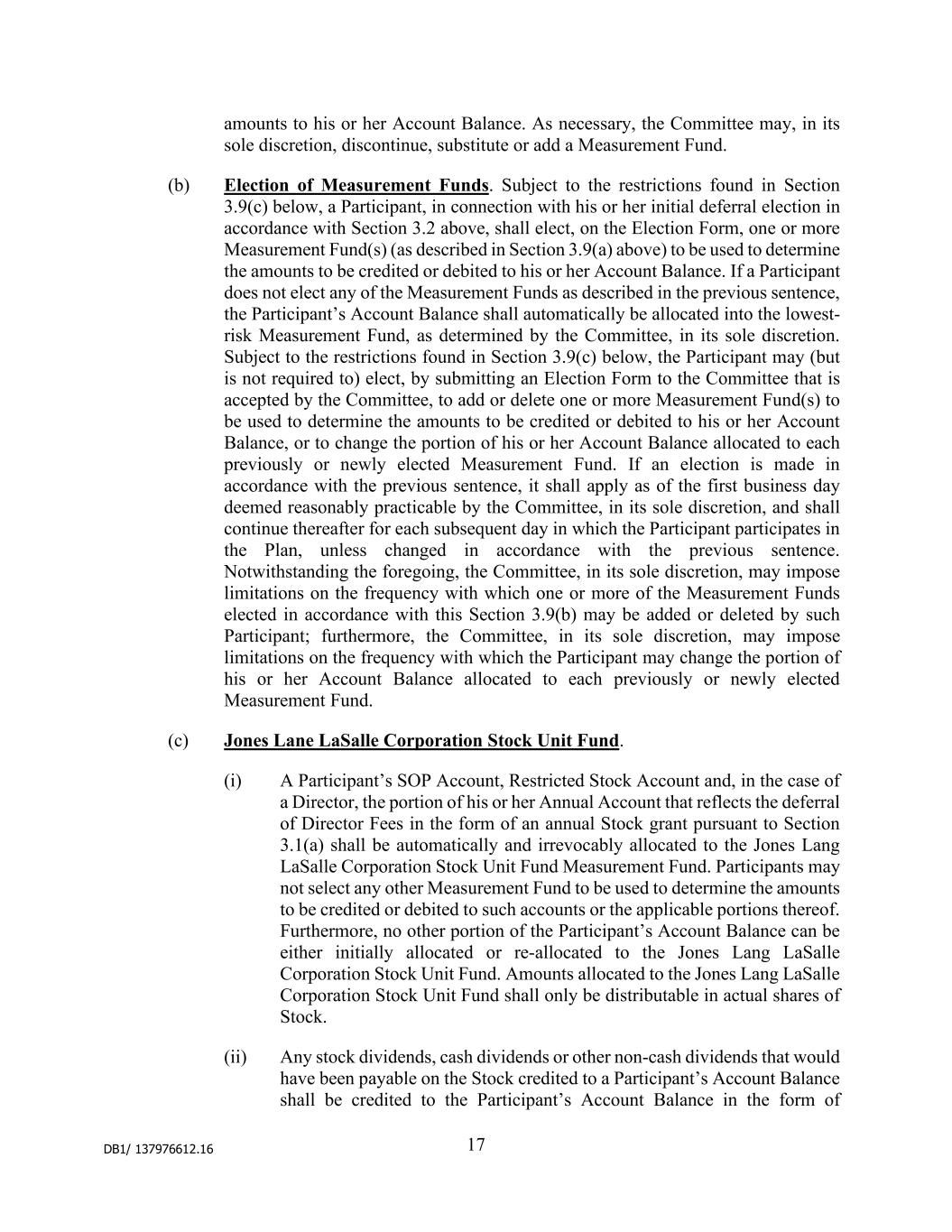 DB1/ 137976612.16 17 amounts to his or her Account Balance. As necessary, the Committee may, in its sole discretion, discontinue, substitute or add a Measurement Fund. (b) Election of Measurement Funds. Subject to the restrictions found in Section 3.9(c) below, a Participant, in connection with his or her initial deferral election in accordance with Section 3.2 above, shall elect, on the Election Form, one or more Measurement Fund(s) (as described in Section 3.9(a) above) to be used to determine the amounts to be credited or debited to his or her Account Balance. If a Participant does not elect any of the Measurement Funds as described in the previous sentence, the Participant’s Account Balance shall automatically be allocated into the lowest- risk Measurement Fund, as determined by the Committee, in its sole discretion. Subject to the restrictions found in Section 3.9(c) below, the Participant may (but is not required to) elect, by submitting an Election Form to the Committee that is accepted by the Committee, to add or delete one or more Measurement Fund(s) to be used to determine the amounts to be credited or debited to his or her Account Balance, or to change the portion of his or her Account Balance allocated to each previously or newly elected Measurement Fund. If an election is made in accordance with the previous sentence, it shall apply as of the first business day deemed reasonably practicable by the Committee, in its sole discretion, and shall continue thereafter for each subsequent day in which the Participant participates in the Plan, unless changed in accordance with the previous sentence. Notwithstanding the foregoing, the Committee, in its sole discretion, may impose limitations on the frequency with which one or more of the Measurement Funds elected in accordance with this Section 3.9(b) may be added or deleted by such Participant; furthermore, the Committee, in its sole discretion, may impose limitations on the frequency with which the Participant may change the portion of his or her Account Balance allocated to each previously or newly elected Measurement Fund. (c) Jones Lane LaSalle Corporation Stock Unit Fund. (i) A Participant’s SOP Account, Restricted Stock Account and, in the case of a Director, the portion of his or her Annual Account that reflects the deferral of Director Fees in the form of an annual Stock grant pursuant to Section 3.1(a) shall be automatically and irrevocably allocated to the Jones Lang LaSalle Corporation Stock Unit Fund Measurement Fund. Participants may not select any other Measurement Fund to be used to determine the amounts to be credited or debited to such accounts or the applicable portions thereof. Furthermore, no other portion of the Participant’s Account Balance can be either initially allocated or re-allocated to the Jones Lang LaSalle Corporation Stock Unit Fund. Amounts allocated to the Jones Lang LaSalle Corporation Stock Unit Fund shall only be distributable in actual shares of Stock. (ii) Any stock dividends, cash dividends or other non-cash dividends that would have been payable on the Stock credited to a Participant’s Account Balance shall be credited to the Participant’s Account Balance in the form of