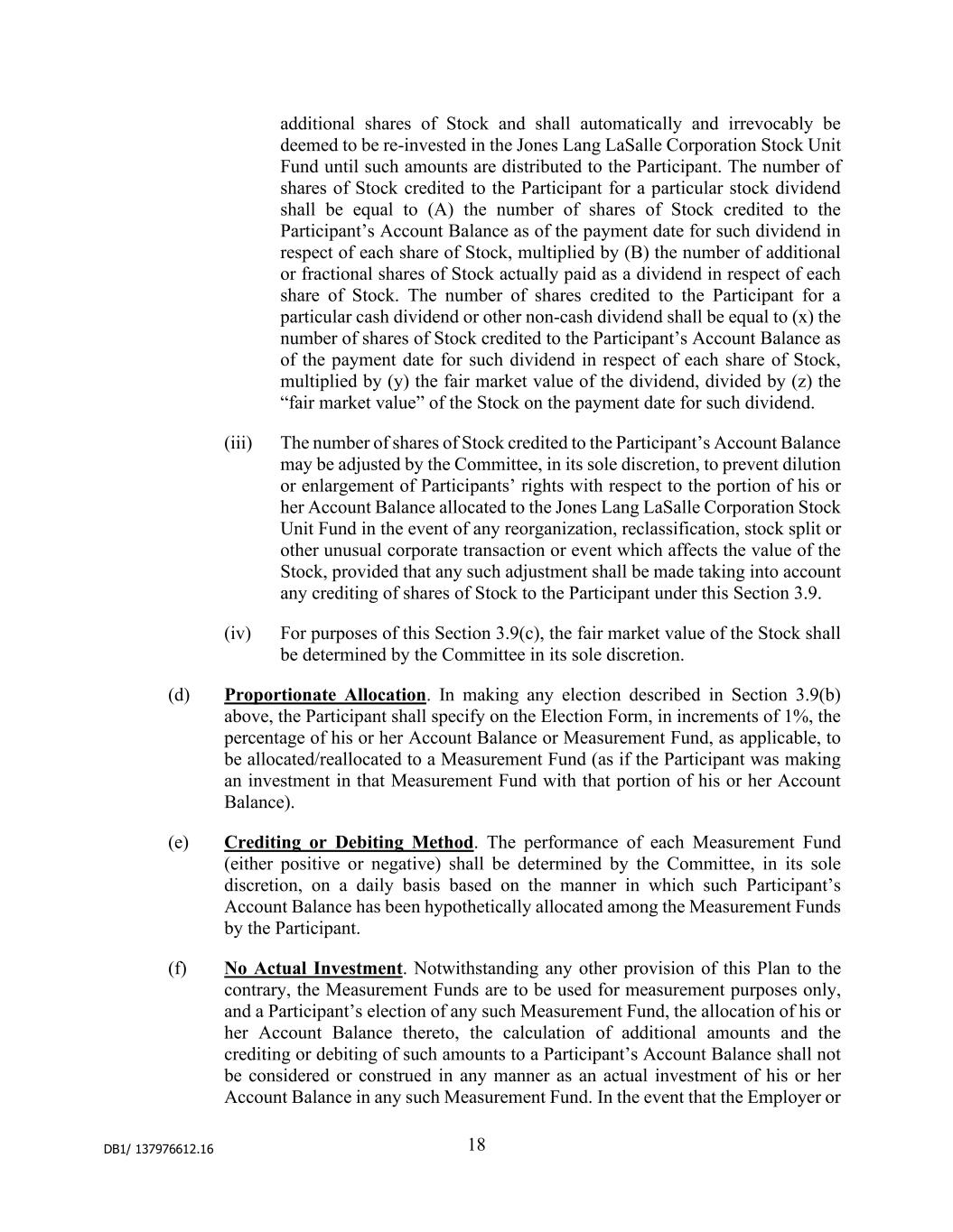 DB1/ 137976612.16 18 additional shares of Stock and shall automatically and irrevocably be deemed to be re-invested in the Jones Lang LaSalle Corporation Stock Unit Fund until such amounts are distributed to the Participant. The number of shares of Stock credited to the Participant for a particular stock dividend shall be equal to (A) the number of shares of Stock credited to the Participant’s Account Balance as of the payment date for such dividend in respect of each share of Stock, multiplied by (B) the number of additional or fractional shares of Stock actually paid as a dividend in respect of each share of Stock. The number of shares credited to the Participant for a particular cash dividend or other non-cash dividend shall be equal to (x) the number of shares of Stock credited to the Participant’s Account Balance as of the payment date for such dividend in respect of each share of Stock, multiplied by (y) the fair market value of the dividend, divided by (z) the “fair market value” of the Stock on the payment date for such dividend. (iii) The number of shares of Stock credited to the Participant’s Account Balance may be adjusted by the Committee, in its sole discretion, to prevent dilution or enlargement of Participants’ rights with respect to the portion of his or her Account Balance allocated to the Jones Lang LaSalle Corporation Stock Unit Fund in the event of any reorganization, reclassification, stock split or other unusual corporate transaction or event which affects the value of the Stock, provided that any such adjustment shall be made taking into account any crediting of shares of Stock to the Participant under this Section 3.9. (iv) For purposes of this Section 3.9(c), the fair market value of the Stock shall be determined by the Committee in its sole discretion. (d) Proportionate Allocation. In making any election described in Section 3.9(b) above, the Participant shall specify on the Election Form, in increments of 1%, the percentage of his or her Account Balance or Measurement Fund, as applicable, to be allocated/reallocated to a Measurement Fund (as if the Participant was making an investment in that Measurement Fund with that portion of his or her Account Balance). (e) Crediting or Debiting Method. The performance of each Measurement Fund (either positive or negative) shall be determined by the Committee, in its sole discretion, on a daily basis based on the manner in which such Participant’s Account Balance has been hypothetically allocated among the Measurement Funds by the Participant. (f) No Actual Investment. Notwithstanding any other provision of this Plan to the contrary, the Measurement Funds are to be used for measurement purposes only, and a Participant’s election of any such Measurement Fund, the allocation of his or her Account Balance thereto, the calculation of additional amounts and the crediting or debiting of such amounts to a Participant’s Account Balance shall not be considered or construed in any manner as an actual investment of his or her Account Balance in any such Measurement Fund. In the event that the Employer or