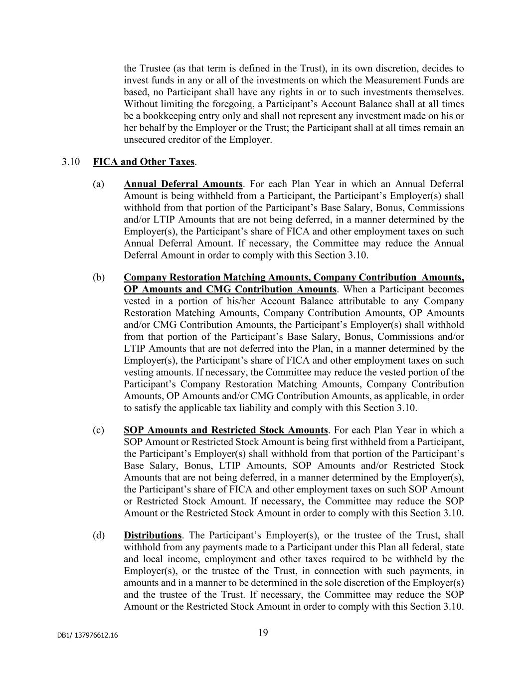 DB1/ 137976612.16 19 the Trustee (as that term is defined in the Trust), in its own discretion, decides to invest funds in any or all of the investments on which the Measurement Funds are based, no Participant shall have any rights in or to such investments themselves. Without limiting the foregoing, a Participant’s Account Balance shall at all times be a bookkeeping entry only and shall not represent any investment made on his or her behalf by the Employer or the Trust; the Participant shall at all times remain an unsecured creditor of the Employer. 3.10 FICA and Other Taxes. (a) Annual Deferral Amounts. For each Plan Year in which an Annual Deferral Amount is being withheld from a Participant, the Participant’s Employer(s) shall withhold from that portion of the Participant’s Base Salary, Bonus, Commissions and/or LTIP Amounts that are not being deferred, in a manner determined by the Employer(s), the Participant’s share of FICA and other employment taxes on such Annual Deferral Amount. If necessary, the Committee may reduce the Annual Deferral Amount in order to comply with this Section 3.10. (b) Company Restoration Matching Amounts, Company Contribution Amounts, OP Amounts and CMG Contribution Amounts. When a Participant becomes vested in a portion of his/her Account Balance attributable to any Company Restoration Matching Amounts, Company Contribution Amounts, OP Amounts and/or CMG Contribution Amounts, the Participant’s Employer(s) shall withhold from that portion of the Participant’s Base Salary, Bonus, Commissions and/or LTIP Amounts that are not deferred into the Plan, in a manner determined by the Employer(s), the Participant’s share of FICA and other employment taxes on such vesting amounts. If necessary, the Committee may reduce the vested portion of the Participant’s Company Restoration Matching Amounts, Company Contribution Amounts, OP Amounts and/or CMG Contribution Amounts, as applicable, in order to satisfy the applicable tax liability and comply with this Section 3.10. (c) SOP Amounts and Restricted Stock Amounts. For each Plan Year in which a SOP Amount or Restricted Stock Amount is being first withheld from a Participant, the Participant’s Employer(s) shall withhold from that portion of the Participant’s Base Salary, Bonus, LTIP Amounts, SOP Amounts and/or Restricted Stock Amounts that are not being deferred, in a manner determined by the Employer(s), the Participant’s share of FICA and other employment taxes on such SOP Amount or Restricted Stock Amount. If necessary, the Committee may reduce the SOP Amount or the Restricted Stock Amount in order to comply with this Section 3.10. (d) Distributions. The Participant’s Employer(s), or the trustee of the Trust, shall withhold from any payments made to a Participant under this Plan all federal, state and local income, employment and other taxes required to be withheld by the Employer(s), or the trustee of the Trust, in connection with such payments, in amounts and in a manner to be determined in the sole discretion of the Employer(s) and the trustee of the Trust. If necessary, the Committee may reduce the SOP Amount or the Restricted Stock Amount in order to comply with this Section 3.10.