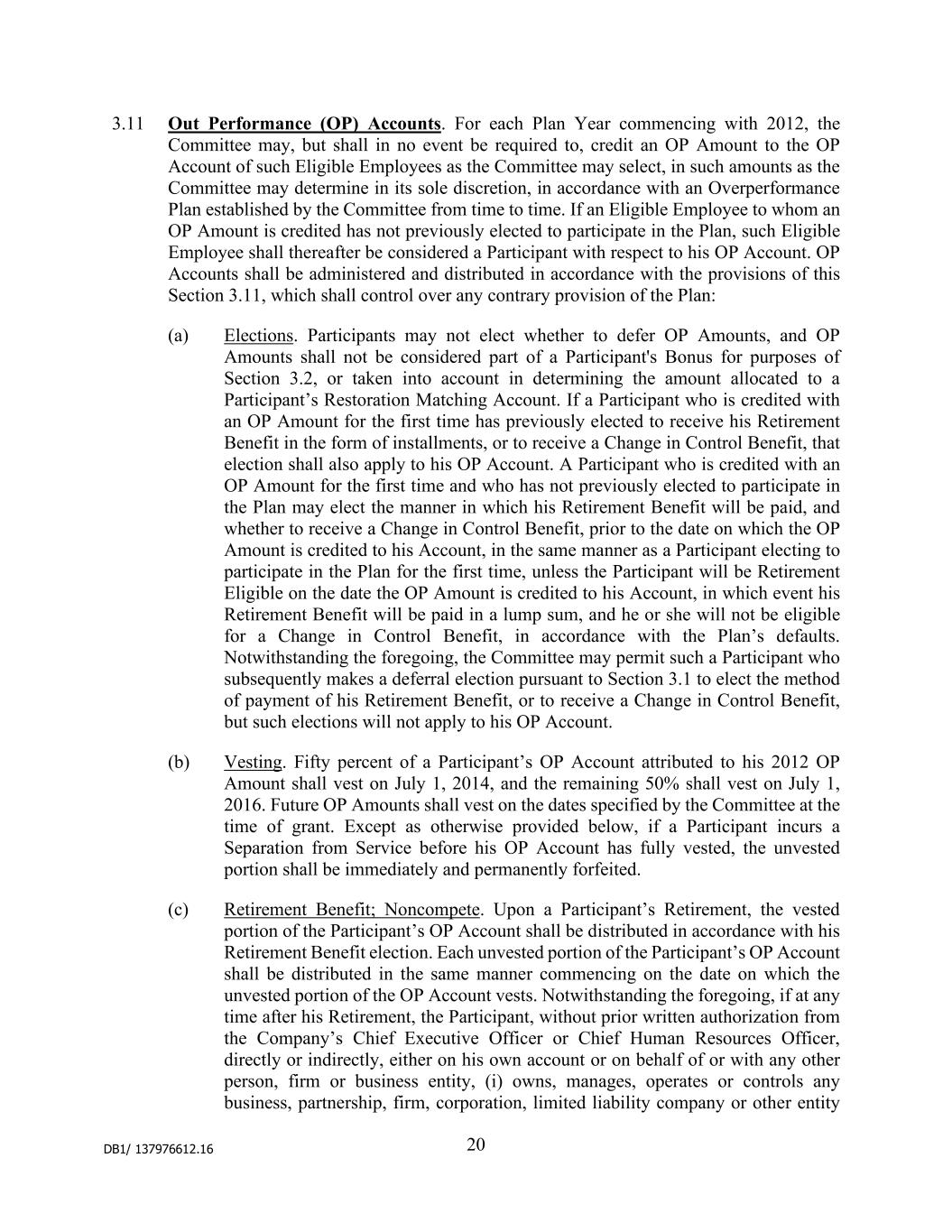 DB1/ 137976612.16 20 3.11 Out Performance (OP) Accounts. For each Plan Year commencing with 2012, the Committee may, but shall in no event be required to, credit an OP Amount to the OP Account of such Eligible Employees as the Committee may select, in such amounts as the Committee may determine in its sole discretion, in accordance with an Overperformance Plan established by the Committee from time to time. If an Eligible Employee to whom an OP Amount is credited has not previously elected to participate in the Plan, such Eligible Employee shall thereafter be considered a Participant with respect to his OP Account. OP Accounts shall be administered and distributed in accordance with the provisions of this Section 3.11, which shall control over any contrary provision of the Plan: (a) Elections. Participants may not elect whether to defer OP Amounts, and OP Amounts shall not be considered part of a Participant's Bonus for purposes of Section 3.2, or taken into account in determining the amount allocated to a Participant’s Restoration Matching Account. If a Participant who is credited with an OP Amount for the first time has previously elected to receive his Retirement Benefit in the form of installments, or to receive a Change in Control Benefit, that election shall also apply to his OP Account. A Participant who is credited with an OP Amount for the first time and who has not previously elected to participate in the Plan may elect the manner in which his Retirement Benefit will be paid, and whether to receive a Change in Control Benefit, prior to the date on which the OP Amount is credited to his Account, in the same manner as a Participant electing to participate in the Plan for the first time, unless the Participant will be Retirement Eligible on the date the OP Amount is credited to his Account, in which event his Retirement Benefit will be paid in a lump sum, and he or she will not be eligible for a Change in Control Benefit, in accordance with the Plan’s defaults. Notwithstanding the foregoing, the Committee may permit such a Participant who subsequently makes a deferral election pursuant to Section 3.1 to elect the method of payment of his Retirement Benefit, or to receive a Change in Control Benefit, but such elections will not apply to his OP Account. (b) Vesting. Fifty percent of a Participant’s OP Account attributed to his 2012 OP Amount shall vest on July 1, 2014, and the remaining 50% shall vest on July 1, 2016. Future OP Amounts shall vest on the dates specified by the Committee at the time of grant. Except as otherwise provided below, if a Participant incurs a Separation from Service before his OP Account has fully vested, the unvested portion shall be immediately and permanently forfeited. (c) Retirement Benefit; Noncompete. Upon a Participant’s Retirement, the vested portion of the Participant’s OP Account shall be distributed in accordance with his Retirement Benefit election. Each unvested portion of the Participant’s OP Account shall be distributed in the same manner commencing on the date on which the unvested portion of the OP Account vests. Notwithstanding the foregoing, if at any time after his Retirement, the Participant, without prior written authorization from the Company’s Chief Executive Officer or Chief Human Resources Officer, directly or indirectly, either on his own account or on behalf of or with any other person, firm or business entity, (i) owns, manages, operates or controls any business, partnership, firm, corporation, limited liability company or other entity