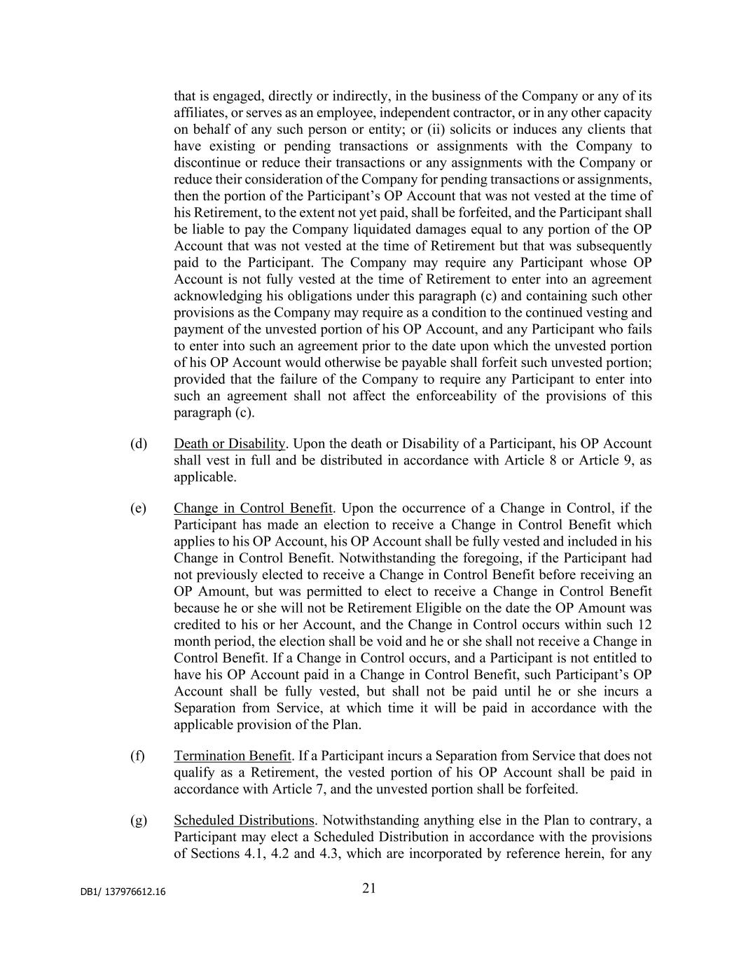 DB1/ 137976612.16 21 that is engaged, directly or indirectly, in the business of the Company or any of its affiliates, or serves as an employee, independent contractor, or in any other capacity on behalf of any such person or entity; or (ii) solicits or induces any clients that have existing or pending transactions or assignments with the Company to discontinue or reduce their transactions or any assignments with the Company or reduce their consideration of the Company for pending transactions or assignments, then the portion of the Participant’s OP Account that was not vested at the time of his Retirement, to the extent not yet paid, shall be forfeited, and the Participant shall be liable to pay the Company liquidated damages equal to any portion of the OP Account that was not vested at the time of Retirement but that was subsequently paid to the Participant. The Company may require any Participant whose OP Account is not fully vested at the time of Retirement to enter into an agreement acknowledging his obligations under this paragraph (c) and containing such other provisions as the Company may require as a condition to the continued vesting and payment of the unvested portion of his OP Account, and any Participant who fails to enter into such an agreement prior to the date upon which the unvested portion of his OP Account would otherwise be payable shall forfeit such unvested portion; provided that the failure of the Company to require any Participant to enter into such an agreement shall not affect the enforceability of the provisions of this paragraph (c). (d) Death or Disability. Upon the death or Disability of a Participant, his OP Account shall vest in full and be distributed in accordance with Article 8 or Article 9, as applicable. (e) Change in Control Benefit. Upon the occurrence of a Change in Control, if the Participant has made an election to receive a Change in Control Benefit which applies to his OP Account, his OP Account shall be fully vested and included in his Change in Control Benefit. Notwithstanding the foregoing, if the Participant had not previously elected to receive a Change in Control Benefit before receiving an OP Amount, but was permitted to elect to receive a Change in Control Benefit because he or she will not be Retirement Eligible on the date the OP Amount was credited to his or her Account, and the Change in Control occurs within such 12 month period, the election shall be void and he or she shall not receive a Change in Control Benefit. If a Change in Control occurs, and a Participant is not entitled to have his OP Account paid in a Change in Control Benefit, such Participant’s OP Account shall be fully vested, but shall not be paid until he or she incurs a Separation from Service, at which time it will be paid in accordance with the applicable provision of the Plan. (f) Termination Benefit. If a Participant incurs a Separation from Service that does not qualify as a Retirement, the vested portion of his OP Account shall be paid in accordance with Article 7, and the unvested portion shall be forfeited. (g) Scheduled Distributions. Notwithstanding anything else in the Plan to contrary, a Participant may elect a Scheduled Distribution in accordance with the provisions of Sections 4.1, 4.2 and 4.3, which are incorporated by reference herein, for any
