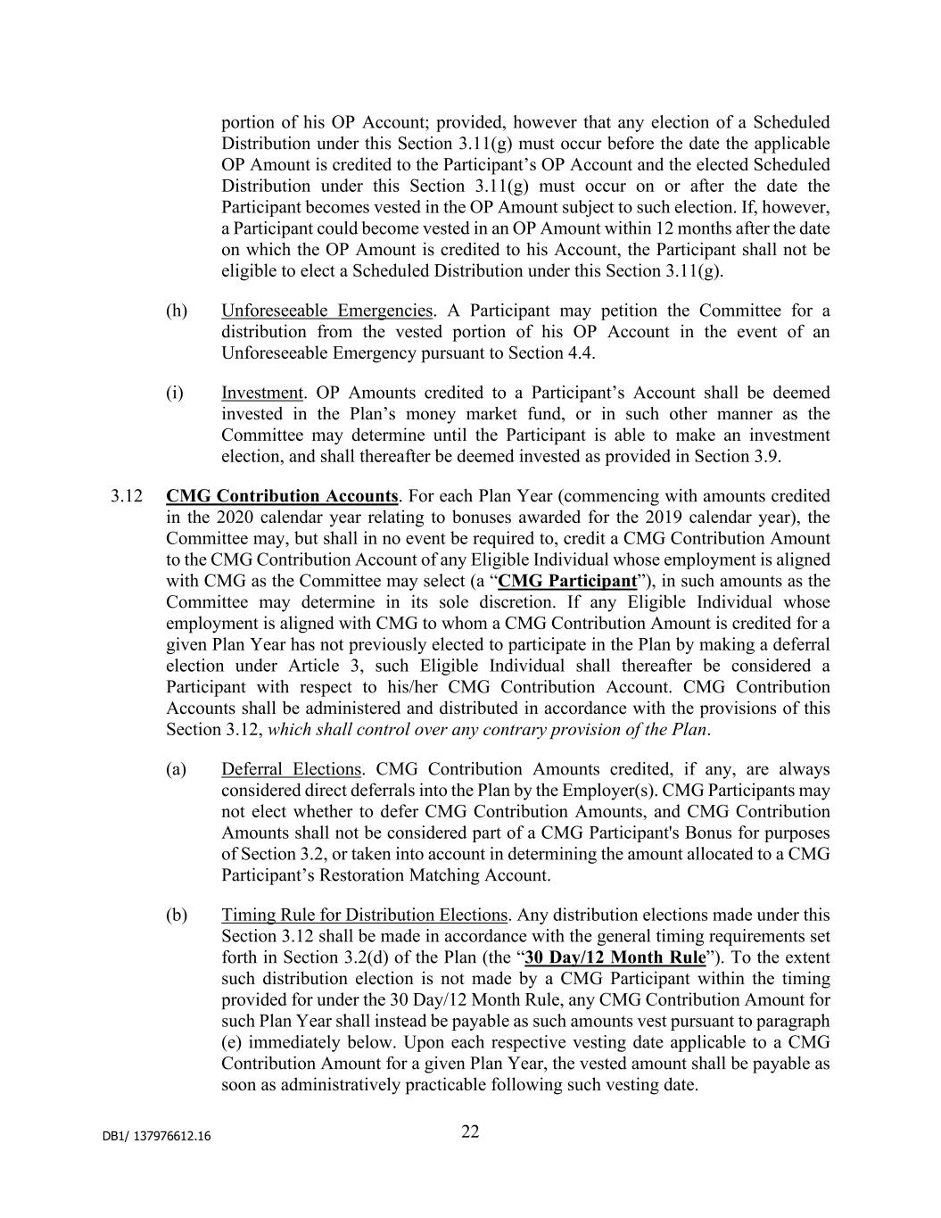 DB1/ 137976612.16 22 portion of his OP Account; provided, however that any election of a Scheduled Distribution under this Section 3.11(g) must occur before the date the applicable OP Amount is credited to the Participant’s OP Account and the elected Scheduled Distribution under this Section 3.11(g) must occur on or after the date the Participant becomes vested in the OP Amount subject to such election. If, however, a Participant could become vested in an OP Amount within 12 months after the date on which the OP Amount is credited to his Account, the Participant shall not be eligible to elect a Scheduled Distribution under this Section 3.11(g). (h) Unforeseeable Emergencies. A Participant may petition the Committee for a distribution from the vested portion of his OP Account in the event of an Unforeseeable Emergency pursuant to Section 4.4. (i) Investment. OP Amounts credited to a Participant’s Account shall be deemed invested in the Plan’s money market fund, or in such other manner as the Committee may determine until the Participant is able to make an investment election, and shall thereafter be deemed invested as provided in Section 3.9. 3.12 CMG Contribution Accounts. For each Plan Year (commencing with amounts credited in the 2020 calendar year relating to bonuses awarded for the 2019 calendar year), the Committee may, but shall in no event be required to, credit a CMG Contribution Amount to the CMG Contribution Account of any Eligible Individual whose employment is aligned with CMG as the Committee may select (a “CMG Participant”), in such amounts as the Committee may determine in its sole discretion. If any Eligible Individual whose employment is aligned with CMG to whom a CMG Contribution Amount is credited for a given Plan Year has not previously elected to participate in the Plan by making a deferral election under Article 3, such Eligible Individual shall thereafter be considered a Participant with respect to his/her CMG Contribution Account. CMG Contribution Accounts shall be administered and distributed in accordance with the provisions of this Section 3.12, which shall control over any contrary provision of the Plan. (a) Deferral Elections. CMG Contribution Amounts credited, if any, are always considered direct deferrals into the Plan by the Employer(s). CMG Participants may not elect whether to defer CMG Contribution Amounts, and CMG Contribution Amounts shall not be considered part of a CMG Participant's Bonus for purposes of Section 3.2, or taken into account in determining the amount allocated to a CMG Participant’s Restoration Matching Account. (b) Timing Rule for Distribution Elections. Any distribution elections made under this Section 3.12 shall be made in accordance with the general timing requirements set forth in Section 3.2(d) of the Plan (the “30 Day/12 Month Rule”). To the extent such distribution election is not made by a CMG Participant within the timing provided for under the 30 Day/12 Month Rule, any CMG Contribution Amount for such Plan Year shall instead be payable as such amounts vest pursuant to paragraph (e) immediately below. Upon each respective vesting date applicable to a CMG Contribution Amount for a given Plan Year, the vested amount shall be payable as soon as administratively practicable following such vesting date.