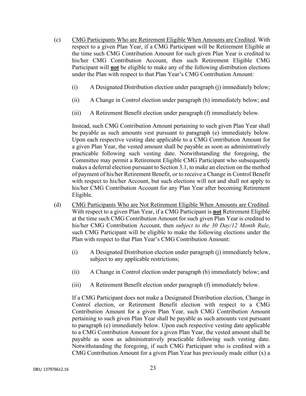DB1/ 137976612.16 23 (c) CMG Participants Who are Retirement Eligible When Amounts are Credited. With respect to a given Plan Year, if a CMG Participant will be Retirement Eligible at the time such CMG Contribution Amount for such given Plan Year is credited to his/her CMG Contribution Account, then such Retirement Eligible CMG Participant will not be eligible to make any of the following distribution elections under the Plan with respect to that Plan Year’s CMG Contribution Amount: (i) A Designated Distribution election under paragraph (j) immediately below; (ii) A Change in Control election under paragraph (h) immediately below; and (iii) A Retirement Benefit election under paragraph (f) immediately below. Instead, such CMG Contribution Amount pertaining to such given Plan Year shall be payable as such amounts vest pursuant to paragraph (e) immediately below. Upon each respective vesting date applicable to a CMG Contribution Amount for a given Plan Year, the vested amount shall be payable as soon as administratively practicable following such vesting date. Notwithstanding the foregoing, the Committee may permit a Retirement Eligible CMG Participant who subsequently makes a deferral election pursuant to Section 3.1, to make an election on the method of payment of his/her Retirement Benefit, or to receive a Change in Control Benefit with respect to his/her Account, but such elections will not and shall not apply to his/her CMG Contribution Account for any Plan Year after becoming Retirement Eligible. (d) CMG Participants Who are Not Retirement Eligible When Amounts are Credited. With respect to a given Plan Year, if a CMG Participant is not Retirement Eligible at the time such CMG Contribution Amount for such given Plan Year is credited to his/her CMG Contribution Account, then subject to the 30 Day/12 Month Rule, such CMG Participant will be eligible to make the following elections under the Plan with respect to that Plan Year’s CMG Contribution Amount: (i) A Designated Distribution election under paragraph (j) immediately below, subject to any applicable restrictions; (ii) A Change in Control election under paragraph (h) immediately below; and (iii) A Retirement Benefit election under paragraph (f) immediately below. If a CMG Participant does not make a Designated Distribution election, Change in Control election, or Retirement Benefit election with respect to a CMG Contribution Amount for a given Plan Year, such CMG Contribution Amount pertaining to such given Plan Year shall be payable as such amounts vest pursuant to paragraph (e) immediately below. Upon each respective vesting date applicable to a CMG Contribution Amount for a given Plan Year, the vested amount shall be payable as soon as administratively practicable following such vesting date. Notwithstanding the foregoing, if such CMG Participant who is credited with a CMG Contribution Amount for a given Plan Year has previously made either (x) a