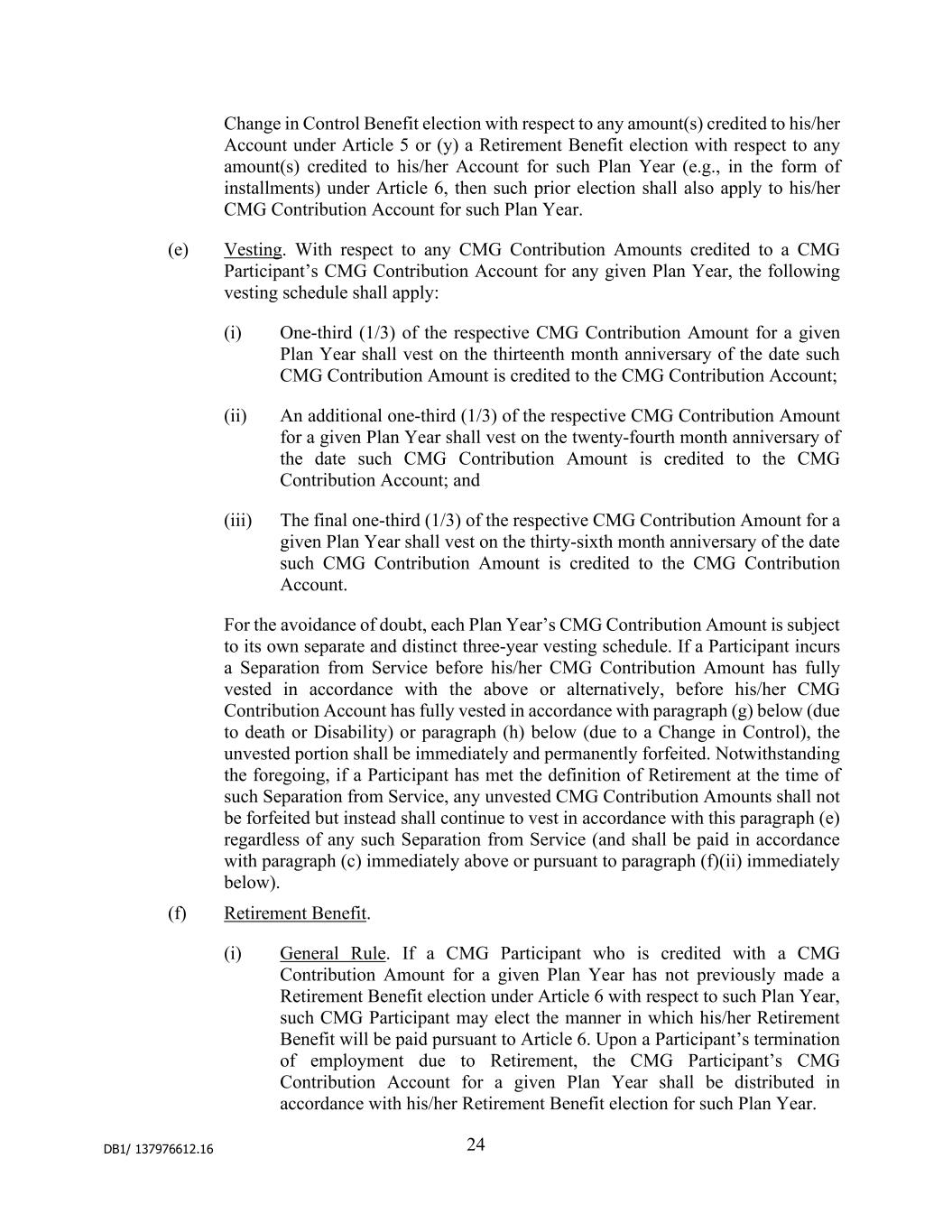 DB1/ 137976612.16 24 Change in Control Benefit election with respect to any amount(s) credited to his/her Account under Article 5 or (y) a Retirement Benefit election with respect to any amount(s) credited to his/her Account for such Plan Year (e.g., in the form of installments) under Article 6, then such prior election shall also apply to his/her CMG Contribution Account for such Plan Year. (e) Vesting. With respect to any CMG Contribution Amounts credited to a CMG Participant’s CMG Contribution Account for any given Plan Year, the following vesting schedule shall apply: (i) One-third (1/3) of the respective CMG Contribution Amount for a given Plan Year shall vest on the thirteenth month anniversary of the date such CMG Contribution Amount is credited to the CMG Contribution Account; (ii) An additional one-third (1/3) of the respective CMG Contribution Amount for a given Plan Year shall vest on the twenty-fourth month anniversary of the date such CMG Contribution Amount is credited to the CMG Contribution Account; and (iii) The final one-third (1/3) of the respective CMG Contribution Amount for a given Plan Year shall vest on the thirty-sixth month anniversary of the date such CMG Contribution Amount is credited to the CMG Contribution Account. For the avoidance of doubt, each Plan Year’s CMG Contribution Amount is subject to its own separate and distinct three-year vesting schedule. If a Participant incurs a Separation from Service before his/her CMG Contribution Amount has fully vested in accordance with the above or alternatively, before his/her CMG Contribution Account has fully vested in accordance with paragraph (g) below (due to death or Disability) or paragraph (h) below (due to a Change in Control), the unvested portion shall be immediately and permanently forfeited. Notwithstanding the foregoing, if a Participant has met the definition of Retirement at the time of such Separation from Service, any unvested CMG Contribution Amounts shall not be forfeited but instead shall continue to vest in accordance with this paragraph (e) regardless of any such Separation from Service (and shall be paid in accordance with paragraph (c) immediately above or pursuant to paragraph (f)(ii) immediately below). (f) Retirement Benefit. (i) General Rule. If a CMG Participant who is credited with a CMG Contribution Amount for a given Plan Year has not previously made a Retirement Benefit election under Article 6 with respect to such Plan Year, such CMG Participant may elect the manner in which his/her Retirement Benefit will be paid pursuant to Article 6. Upon a Participant’s termination of employment due to Retirement, the CMG Participant’s CMG Contribution Account for a given Plan Year shall be distributed in accordance with his/her Retirement Benefit election for such Plan Year.