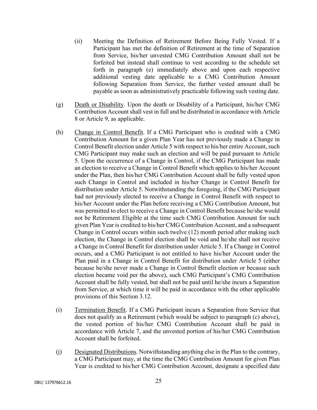 DB1/ 137976612.16 25 (ii) Meeting the Definition of Retirement Before Being Fully Vested. If a Participant has met the definition of Retirement at the time of Separation from Service, his/her unvested CMG Contribution Amount shall not be forfeited but instead shall continue to vest according to the schedule set forth in paragraph (e) immediately above and upon each respective additional vesting date applicable to a CMG Contribution Amount following Separation from Service, the further vested amount shall be payable as soon as administratively practicable following such vesting date. (g) Death or Disability. Upon the death or Disability of a Participant, his/her CMG Contribution Account shall vest in full and be distributed in accordance with Article 8 or Article 9, as applicable. (h) Change in Control Benefit. If a CMG Participant who is credited with a CMG Contribution Amount for a given Plan Year has not previously made a Change in Control Benefit election under Article 5 with respect to his/her entire Account, such CMG Participant may make such an election and will be paid pursuant to Article 5. Upon the occurrence of a Change in Control, if the CMG Participant has made an election to receive a Change in Control Benefit which applies to his/her Account under the Plan, then his/her CMG Contribution Account shall be fully vested upon such Change in Control and included in his/her Change in Control Benefit for distribution under Article 5. Notwithstanding the foregoing, if the CMG Participant had not previously elected to receive a Change in Control Benefit with respect to his/her Account under the Plan before receiving a CMG Contribution Amount, but was permitted to elect to receive a Change in Control Benefit because he/she would not be Retirement Eligible at the time such CMG Contribution Amount for such given Plan Year is credited to his/her CMG Contribution Account, and a subsequent Change in Control occurs within such twelve (12) month period after making such election, the Change in Control election shall be void and he/she shall not receive a Change in Control Benefit for distribution under Article 5. If a Change in Control occurs, and a CMG Participant is not entitled to have his/her Account under the Plan paid in a Change in Control Benefit for distribution under Article 5 (either because he/she never made a Change in Control Benefit election or because such election became void per the above), such CMG Participant’s CMG Contribution Account shall be fully vested, but shall not be paid until he/she incurs a Separation from Service, at which time it will be paid in accordance with the other applicable provisions of this Section 3.12. (i) Termination Benefit. If a CMG Participant incurs a Separation from Service that does not qualify as a Retirement (which would be subject to paragraph (c) above), the vested portion of his/her CMG Contribution Account shall be paid in accordance with Article 7, and the unvested portion of his/her CMG Contribution Account shall be forfeited. (j) Designated Distributions. Notwithstanding anything else in the Plan to the contrary, a CMG Participant may, at the time the CMG Contribution Amount for given Plan Year is credited to his/her CMG Contribution Account, designate a specified date