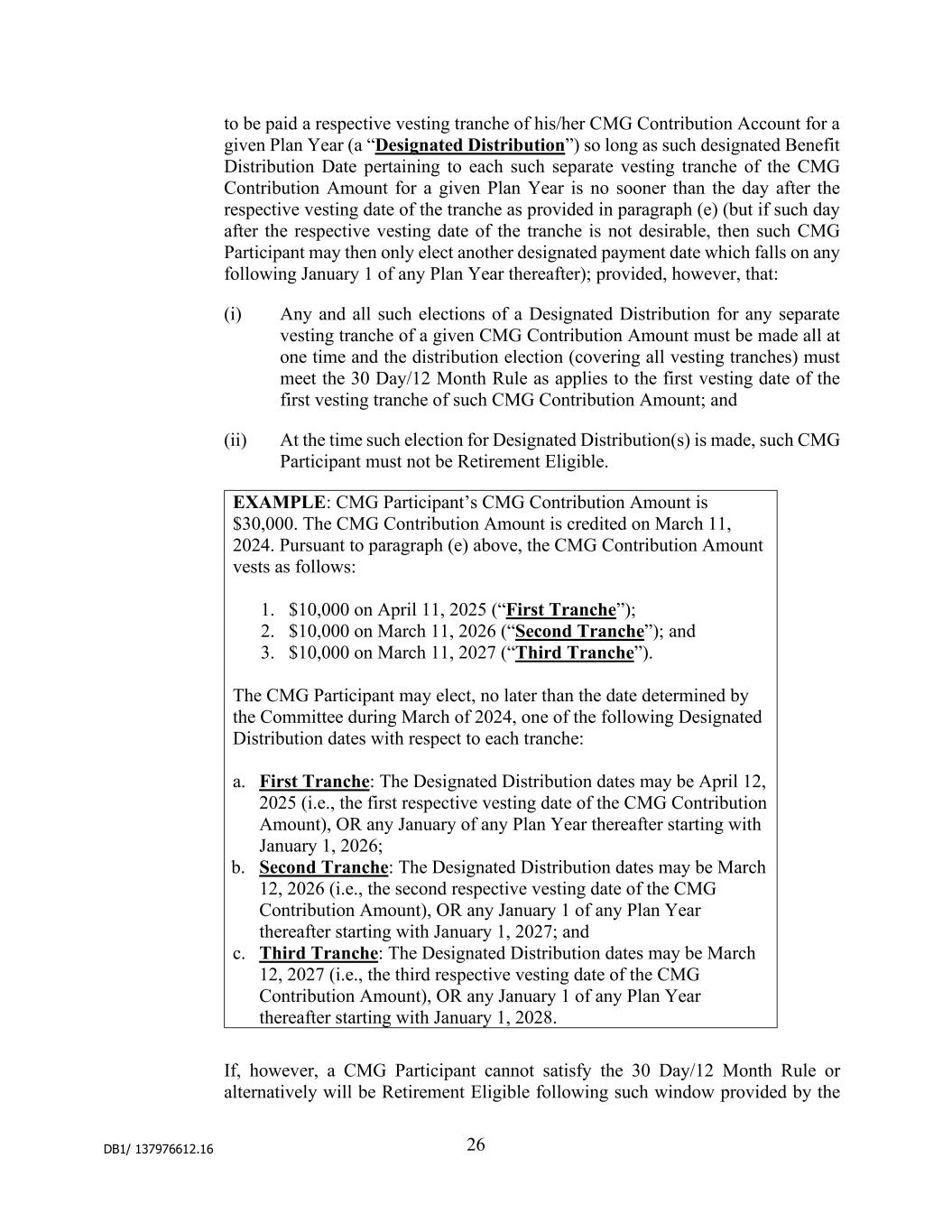 DB1/ 137976612.16 26 to be paid a respective vesting tranche of his/her CMG Contribution Account for a given Plan Year (a “Designated Distribution”) so long as such designated Benefit Distribution Date pertaining to each such separate vesting tranche of the CMG Contribution Amount for a given Plan Year is no sooner than the day after the respective vesting date of the tranche as provided in paragraph (e) (but if such day after the respective vesting date of the tranche is not desirable, then such CMG Participant may then only elect another designated payment date which falls on any following January 1 of any Plan Year thereafter); provided, however, that: (i) Any and all such elections of a Designated Distribution for any separate vesting tranche of a given CMG Contribution Amount must be made all at one time and the distribution election (covering all vesting tranches) must meet the 30 Day/12 Month Rule as applies to the first vesting date of the first vesting tranche of such CMG Contribution Amount; and (ii) At the time such election for Designated Distribution(s) is made, such CMG Participant must not be Retirement Eligible. EXAMPLE: CMG Participant’s CMG Contribution Amount is $30,000. The CMG Contribution Amount is credited on March 11, 2024. Pursuant to paragraph (e) above, the CMG Contribution Amount vests as follows: 1. $10,000 on April 11, 2025 (“First Tranche”); 2. $10,000 on March 11, 2026 (“Second Tranche”); and 3. $10,000 on March 11, 2027 (“Third Tranche”). The CMG Participant may elect, no later than the date determined by the Committee during March of 2024, one of the following Designated Distribution dates with respect to each tranche: a. First Tranche: The Designated Distribution dates may be April 12, 2025 (i.e., the first respective vesting date of the CMG Contribution Amount), OR any January of any Plan Year thereafter starting with January 1, 2026; b. Second Tranche: The Designated Distribution dates may be March 12, 2026 (i.e., the second respective vesting date of the CMG Contribution Amount), OR any January 1 of any Plan Year thereafter starting with January 1, 2027; and c. Third Tranche: The Designated Distribution dates may be March 12, 2027 (i.e., the third respective vesting date of the CMG Contribution Amount), OR any January 1 of any Plan Year thereafter starting with January 1, 2028. If, however, a CMG Participant cannot satisfy the 30 Day/12 Month Rule or alternatively will be Retirement Eligible following such window provided by the