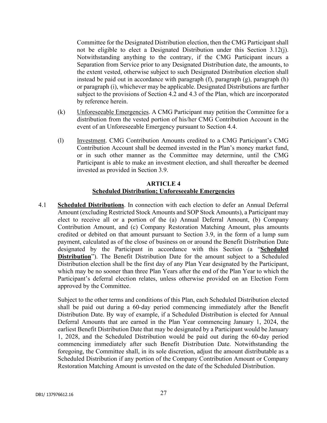 DB1/ 137976612.16 27 Committee for the Designated Distribution election, then the CMG Participant shall not be eligible to elect a Designated Distribution under this Section 3.12(j). Notwithstanding anything to the contrary, if the CMG Participant incurs a Separation from Service prior to any Designated Distribution date, the amounts, to the extent vested, otherwise subject to such Designated Distribution election shall instead be paid out in accordance with paragraph (f), paragraph (g), paragraph (h) or paragraph (i), whichever may be applicable. Designated Distributions are further subject to the provisions of Section 4.2 and 4.3 of the Plan, which are incorporated by reference herein. (k) Unforeseeable Emergencies. A CMG Participant may petition the Committee for a distribution from the vested portion of his/her CMG Contribution Account in the event of an Unforeseeable Emergency pursuant to Section 4.4. (l) Investment. CMG Contribution Amounts credited to a CMG Participant’s CMG Contribution Account shall be deemed invested in the Plan’s money market fund, or in such other manner as the Committee may determine, until the CMG Participant is able to make an investment election, and shall thereafter be deemed invested as provided in Section 3.9. ARTICLE 4 Scheduled Distribution; Unforeseeable Emergencies 4.1 Scheduled Distributions. In connection with each election to defer an Annual Deferral Amount (excluding Restricted Stock Amounts and SOP Stock Amounts), a Participant may elect to receive all or a portion of the (a) Annual Deferral Amount, (b) Company Contribution Amount, and (c) Company Restoration Matching Amount, plus amounts credited or debited on that amount pursuant to Section 3.9, in the form of a lump sum payment, calculated as of the close of business on or around the Benefit Distribution Date designated by the Participant in accordance with this Section (a “Scheduled Distribution”). The Benefit Distribution Date for the amount subject to a Scheduled Distribution election shall be the first day of any Plan Year designated by the Participant, which may be no sooner than three Plan Years after the end of the Plan Year to which the Participant’s deferral election relates, unless otherwise provided on an Election Form approved by the Committee. Subject to the other terms and conditions of this Plan, each Scheduled Distribution elected shall be paid out during a 60-day period commencing immediately after the Benefit Distribution Date. By way of example, if a Scheduled Distribution is elected for Annual Deferral Amounts that are earned in the Plan Year commencing January 1, 2024, the earliest Benefit Distribution Date that may be designated by a Participant would be January 1, 2028, and the Scheduled Distribution would be paid out during the 60-day period commencing immediately after such Benefit Distribution Date. Notwithstanding the foregoing, the Committee shall, in its sole discretion, adjust the amount distributable as a Scheduled Distribution if any portion of the Company Contribution Amount or Company Restoration Matching Amount is unvested on the date of the Scheduled Distribution.