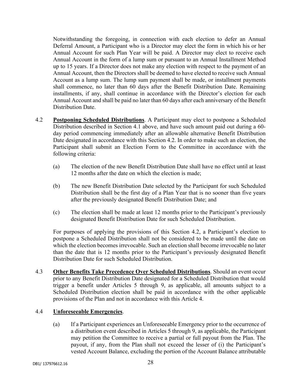 DB1/ 137976612.16 28 Notwithstanding the foregoing, in connection with each election to defer an Annual Deferral Amount, a Participant who is a Director may elect the form in which his or her Annual Account for such Plan Year will be paid. A Director may elect to receive each Annual Account in the form of a lump sum or pursuant to an Annual Installment Method up to 15 years. If a Director does not make any election with respect to the payment of an Annual Account, then the Directors shall be deemed to have elected to receive such Annual Account as a lump sum. The lump sum payment shall be made, or installment payments shall commence, no later than 60 days after the Benefit Distribution Date. Remaining installments, if any, shall continue in accordance with the Director’s election for each Annual Account and shall be paid no later than 60 days after each anniversary of the Benefit Distribution Date. 4.2 Postponing Scheduled Distributions. A Participant may elect to postpone a Scheduled Distribution described in Section 4.1 above, and have such amount paid out during a 60- day period commencing immediately after an allowable alternative Benefit Distribution Date designated in accordance with this Section 4.2. In order to make such an election, the Participant shall submit an Election Form to the Committee in accordance with the following criteria: (a) The election of the new Benefit Distribution Date shall have no effect until at least 12 months after the date on which the election is made; (b) The new Benefit Distribution Date selected by the Participant for such Scheduled Distribution shall be the first day of a Plan Year that is no sooner than five years after the previously designated Benefit Distribution Date; and (c) The election shall be made at least 12 months prior to the Participant’s previously designated Benefit Distribution Date for such Scheduled Distribution. For purposes of applying the provisions of this Section 4.2, a Participant’s election to postpone a Scheduled Distribution shall not be considered to be made until the date on which the election becomes irrevocable. Such an election shall become irrevocable no later than the date that is 12 months prior to the Participant’s previously designated Benefit Distribution Date for such Scheduled Distribution. 4.3 Other Benefits Take Precedence Over Scheduled Distributions. Should an event occur prior to any Benefit Distribution Date designated for a Scheduled Distribution that would trigger a benefit under Articles 5 through 9, as applicable, all amounts subject to a Scheduled Distribution election shall be paid in accordance with the other applicable provisions of the Plan and not in accordance with this Article 4. 4.4 Unforeseeable Emergencies. (a) If a Participant experiences an Unforeseeable Emergency prior to the occurrence of a distribution event described in Articles 5 through 9, as applicable, the Participant may petition the Committee to receive a partial or full payout from the Plan. The payout, if any, from the Plan shall not exceed the lesser of (i) the Participant’s vested Account Balance, excluding the portion of the Account Balance attributable