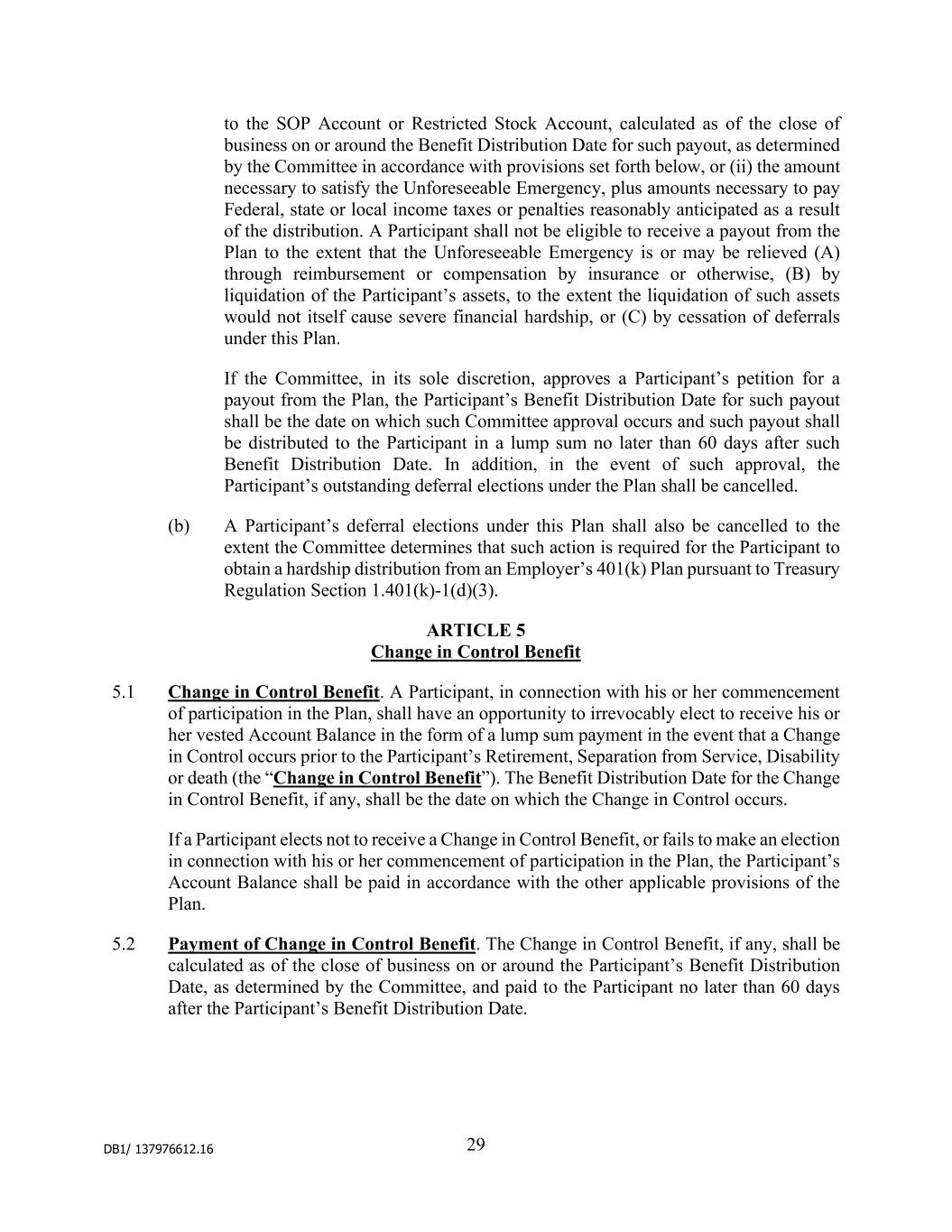 DB1/ 137976612.16 29 to the SOP Account or Restricted Stock Account, calculated as of the close of business on or around the Benefit Distribution Date for such payout, as determined by the Committee in accordance with provisions set forth below, or (ii) the amount necessary to satisfy the Unforeseeable Emergency, plus amounts necessary to pay Federal, state or local income taxes or penalties reasonably anticipated as a result of the distribution. A Participant shall not be eligible to receive a payout from the Plan to the extent that the Unforeseeable Emergency is or may be relieved (A) through reimbursement or compensation by insurance or otherwise, (B) by liquidation of the Participant’s assets, to the extent the liquidation of such assets would not itself cause severe financial hardship, or (C) by cessation of deferrals under this Plan. If the Committee, in its sole discretion, approves a Participant’s petition for a payout from the Plan, the Participant’s Benefit Distribution Date for such payout shall be the date on which such Committee approval occurs and such payout shall be distributed to the Participant in a lump sum no later than 60 days after such Benefit Distribution Date. In addition, in the event of such approval, the Participant’s outstanding deferral elections under the Plan shall be cancelled. (b) A Participant’s deferral elections under this Plan shall also be cancelled to the extent the Committee determines that such action is required for the Participant to obtain a hardship distribution from an Employer’s 401(k) Plan pursuant to Treasury Regulation Section 1.401(k)-1(d)(3). ARTICLE 5 Change in Control Benefit 5.1 Change in Control Benefit. A Participant, in connection with his or her commencement of participation in the Plan, shall have an opportunity to irrevocably elect to receive his or her vested Account Balance in the form of a lump sum payment in the event that a Change in Control occurs prior to the Participant’s Retirement, Separation from Service, Disability or death (the “Change in Control Benefit”). The Benefit Distribution Date for the Change in Control Benefit, if any, shall be the date on which the Change in Control occurs. If a Participant elects not to receive a Change in Control Benefit, or fails to make an election in connection with his or her commencement of participation in the Plan, the Participant’s Account Balance shall be paid in accordance with the other applicable provisions of the Plan. 5.2 Payment of Change in Control Benefit. The Change in Control Benefit, if any, shall be calculated as of the close of business on or around the Participant’s Benefit Distribution Date, as determined by the Committee, and paid to the Participant no later than 60 days after the Participant’s Benefit Distribution Date.