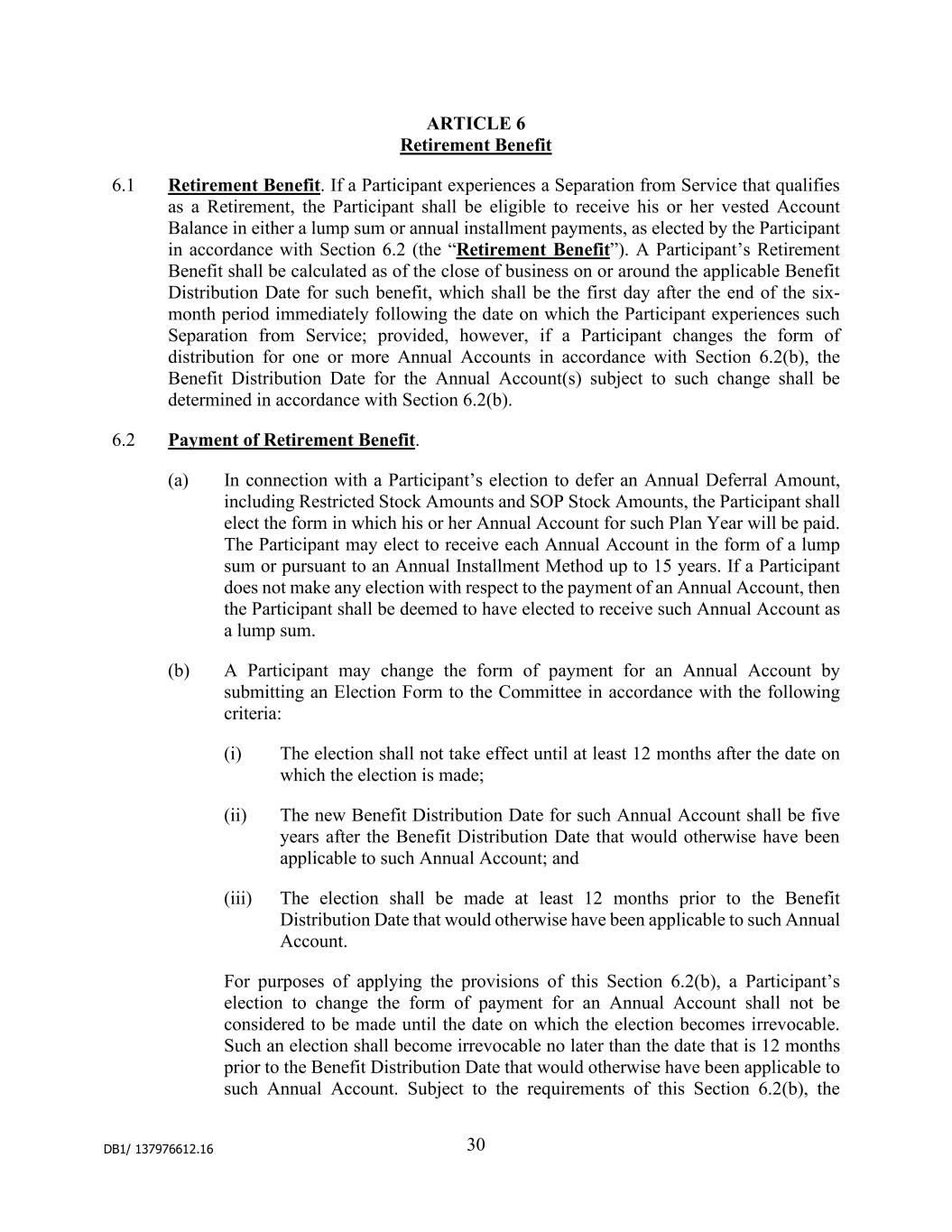 DB1/ 137976612.16 30 ARTICLE 6 Retirement Benefit 6.1 Retirement Benefit. If a Participant experiences a Separation from Service that qualifies as a Retirement, the Participant shall be eligible to receive his or her vested Account Balance in either a lump sum or annual installment payments, as elected by the Participant in accordance with Section 6.2 (the “Retirement Benefit”). A Participant’s Retirement Benefit shall be calculated as of the close of business on or around the applicable Benefit Distribution Date for such benefit, which shall be the first day after the end of the six- month period immediately following the date on which the Participant experiences such Separation from Service; provided, however, if a Participant changes the form of distribution for one or more Annual Accounts in accordance with Section 6.2(b), the Benefit Distribution Date for the Annual Account(s) subject to such change shall be determined in accordance with Section 6.2(b). 6.2 Payment of Retirement Benefit. (a) In connection with a Participant’s election to defer an Annual Deferral Amount, including Restricted Stock Amounts and SOP Stock Amounts, the Participant shall elect the form in which his or her Annual Account for such Plan Year will be paid. The Participant may elect to receive each Annual Account in the form of a lump sum or pursuant to an Annual Installment Method up to 15 years. If a Participant does not make any election with respect to the payment of an Annual Account, then the Participant shall be deemed to have elected to receive such Annual Account as a lump sum. (b) A Participant may change the form of payment for an Annual Account by submitting an Election Form to the Committee in accordance with the following criteria: (i) The election shall not take effect until at least 12 months after the date on which the election is made; (ii) The new Benefit Distribution Date for such Annual Account shall be five years after the Benefit Distribution Date that would otherwise have been applicable to such Annual Account; and (iii) The election shall be made at least 12 months prior to the Benefit Distribution Date that would otherwise have been applicable to such Annual Account. For purposes of applying the provisions of this Section 6.2(b), a Participant’s election to change the form of payment for an Annual Account shall not be considered to be made until the date on which the election becomes irrevocable. Such an election shall become irrevocable no later than the date that is 12 months prior to the Benefit Distribution Date that would otherwise have been applicable to such Annual Account. Subject to the requirements of this Section 6.2(b), the