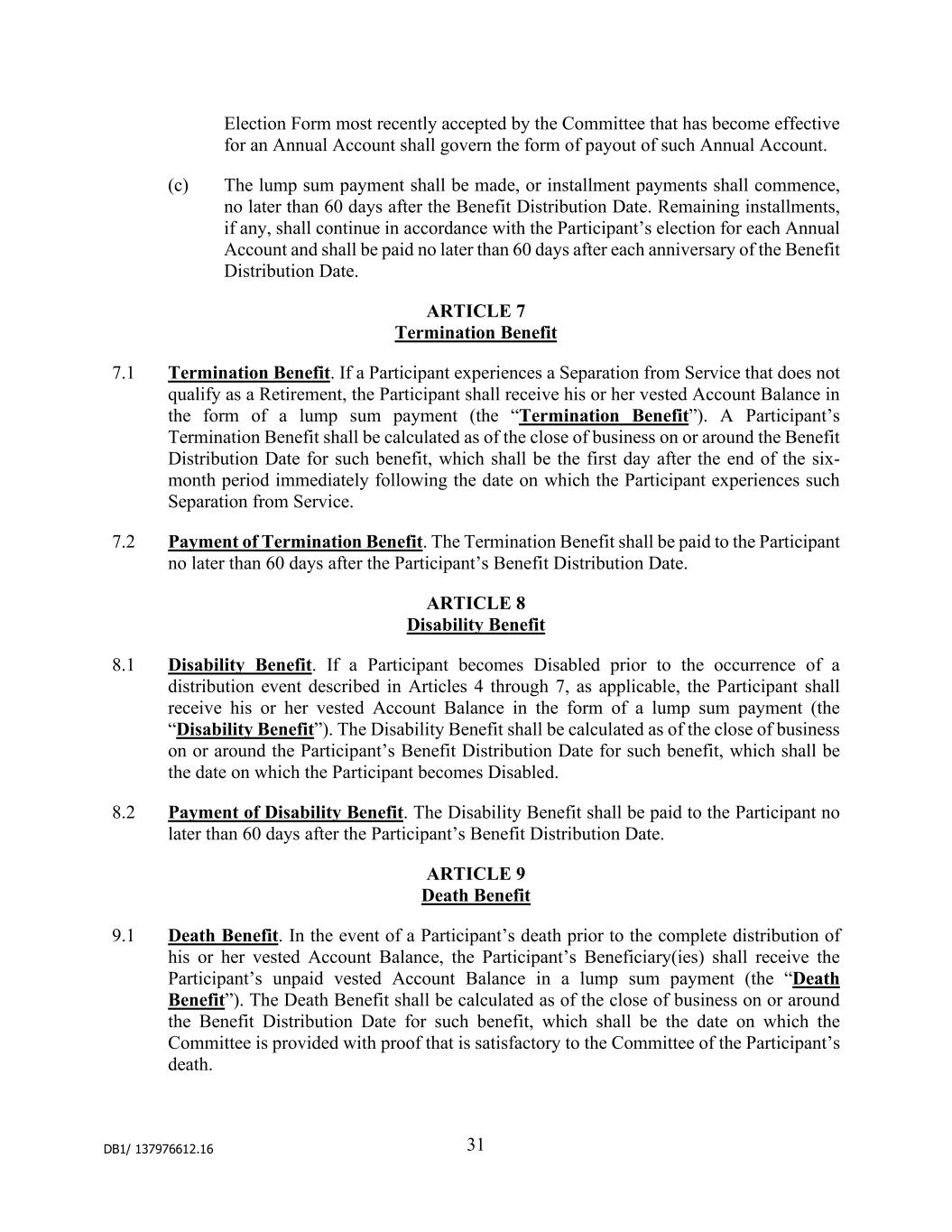 DB1/ 137976612.16 31 Election Form most recently accepted by the Committee that has become effective for an Annual Account shall govern the form of payout of such Annual Account. (c) The lump sum payment shall be made, or installment payments shall commence, no later than 60 days after the Benefit Distribution Date. Remaining installments, if any, shall continue in accordance with the Participant’s election for each Annual Account and shall be paid no later than 60 days after each anniversary of the Benefit Distribution Date. ARTICLE 7 Termination Benefit 7.1 Termination Benefit. If a Participant experiences a Separation from Service that does not qualify as a Retirement, the Participant shall receive his or her vested Account Balance in the form of a lump sum payment (the “Termination Benefit”). A Participant’s Termination Benefit shall be calculated as of the close of business on or around the Benefit Distribution Date for such benefit, which shall be the first day after the end of the six- month period immediately following the date on which the Participant experiences such Separation from Service. 7.2 Payment of Termination Benefit. The Termination Benefit shall be paid to the Participant no later than 60 days after the Participant’s Benefit Distribution Date. ARTICLE 8 Disability Benefit 8.1 Disability Benefit. If a Participant becomes Disabled prior to the occurrence of a distribution event described in Articles 4 through 7, as applicable, the Participant shall receive his or her vested Account Balance in the form of a lump sum payment (the “Disability Benefit”). The Disability Benefit shall be calculated as of the close of business on or around the Participant’s Benefit Distribution Date for such benefit, which shall be the date on which the Participant becomes Disabled. 8.2 Payment of Disability Benefit. The Disability Benefit shall be paid to the Participant no later than 60 days after the Participant’s Benefit Distribution Date. ARTICLE 9 Death Benefit 9.1 Death Benefit. In the event of a Participant’s death prior to the complete distribution of his or her vested Account Balance, the Participant’s Beneficiary(ies) shall receive the Participant’s unpaid vested Account Balance in a lump sum payment (the “Death Benefit”). The Death Benefit shall be calculated as of the close of business on or around the Benefit Distribution Date for such benefit, which shall be the date on which the Committee is provided with proof that is satisfactory to the Committee of the Participant’s death.