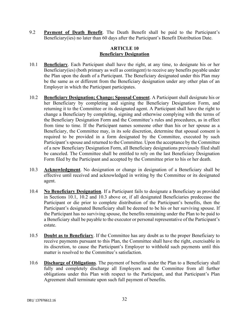 DB1/ 137976612.16 32 9.2 Payment of Death Benefit. The Death Benefit shall be paid to the Participant’s Beneficiary(ies) no later than 60 days after the Participant’s Benefit Distribution Date. ARTICLE 10 Beneficiary Designation 10.1 Beneficiary. Each Participant shall have the right, at any time, to designate his or her Beneficiary(ies) (both primary as well as contingent) to receive any benefits payable under the Plan upon the death of a Participant. The Beneficiary designated under this Plan may be the same as or different from the Beneficiary designation under any other plan of an Employer in which the Participant participates. 10.2 Beneficiary Designation; Change; Spousal Consent. A Participant shall designate his or her Beneficiary by completing and signing the Beneficiary Designation Form, and returning it to the Committee or its designated agent. A Participant shall have the right to change a Beneficiary by completing, signing and otherwise complying with the terms of the Beneficiary Designation Form and the Committee’s rules and procedures, as in effect from time to time. If the Participant names someone other than his or her spouse as a Beneficiary, the Committee may, in its sole discretion, determine that spousal consent is required to be provided in a form designated by the Committee, executed by such Participant’s spouse and returned to the Committee. Upon the acceptance by the Committee of a new Beneficiary Designation Form, all Beneficiary designations previously filed shall be canceled. The Committee shall be entitled to rely on the last Beneficiary Designation Form filed by the Participant and accepted by the Committee prior to his or her death. 10.3 Acknowledgment. No designation or change in designation of a Beneficiary shall be effective until received and acknowledged in writing by the Committee or its designated agent. 10.4 No Beneficiary Designation. If a Participant fails to designate a Beneficiary as provided in Sections 10.1, 10.2 and 10.3 above or, if all designated Beneficiaries predecease the Participant or die prior to complete distribution of the Participant’s benefits, then the Participant’s designated Beneficiary shall be deemed to be his or her surviving spouse. If the Participant has no surviving spouse, the benefits remaining under the Plan to be paid to a Beneficiary shall be payable to the executor or personal representative of the Participant’s estate. 10.5 Doubt as to Beneficiary. If the Committee has any doubt as to the proper Beneficiary to receive payments pursuant to this Plan, the Committee shall have the right, exercisable in its discretion, to cause the Participant’s Employer to withhold such payments until this matter is resolved to the Committee’s satisfaction. 10.6 Discharge of Obligations. The payment of benefits under the Plan to a Beneficiary shall fully and completely discharge all Employers and the Committee from all further obligations under this Plan with respect to the Participant, and that Participant’s Plan Agreement shall terminate upon such full payment of benefits.