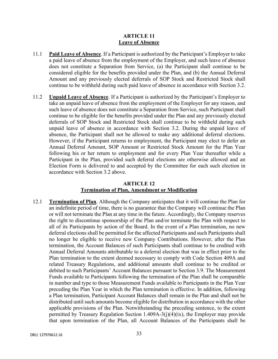 DB1/ 137976612.16 33 ARTICLE 11 Leave of Absence 11.1 Paid Leave of Absence. If a Participant is authorized by the Participant’s Employer to take a paid leave of absence from the employment of the Employer, and such leave of absence does not constitute a Separation from Service, (a) the Participant shall continue to be considered eligible for the benefits provided under the Plan, and (b) the Annual Deferral Amount and any previously elected deferrals of SOP Stock and Restricted Stock shall continue to be withheld during such paid leave of absence in accordance with Section 3.2. 11.2 Unpaid Leave of Absence. If a Participant is authorized by the Participant’s Employer to take an unpaid leave of absence from the employment of the Employer for any reason, and such leave of absence does not constitute a Separation from Service, such Participant shall continue to be eligible for the benefits provided under the Plan and any previously elected deferrals of SOP Stock and Restricted Stock shall continue to be withheld during such unpaid leave of absence in accordance with Section 3.2. During the unpaid leave of absence, the Participant shall not be allowed to make any additional deferral elections. However, if the Participant returns to employment, the Participant may elect to defer an Annual Deferral Amount, SOP Amount or Restricted Stock Amount for the Plan Year following his or her return to employment and for every Plan Year thereafter while a Participant in the Plan, provided such deferral elections are otherwise allowed and an Election Form is delivered to and accepted by the Committee for each such election in accordance with Section 3.2 above. ARTICLE 12 Termination of Plan, Amendment or Modification 12.1 Termination of Plan. Although the Company anticipates that it will continue the Plan for an indefinite period of time, there is no guarantee that the Company will continue the Plan or will not terminate the Plan at any time in the future. Accordingly, the Company reserves the right to discontinue sponsorship of the Plan and/or terminate the Plan with respect to all of its Participants by action of the Board. In the event of a Plan termination, no new deferral elections shall be permitted for the affected Participants and such Participants shall no longer be eligible to receive new Company Contributions. However, after the Plan termination, the Account Balances of such Participants shall continue to be credited with Annual Deferral Amounts attributable to a deferral election that was in effect prior to the Plan termination to the extent deemed necessary to comply with Code Section 409A and related Treasury Regulations, and additional amounts shall continue to be credited or debited to such Participants’ Account Balances pursuant to Section 3.9. The Measurement Funds available to Participants following the termination of the Plan shall be comparable in number and type to those Measurement Funds available to Participants in the Plan Year preceding the Plan Year in which the Plan termination is effective. In addition, following a Plan termination, Participant Account Balances shall remain in the Plan and shall not be distributed until such amounts become eligible for distribution in accordance with the other applicable provisions of the Plan. Notwithstanding the preceding sentence, to the extent permitted by Treasury Regulation Section 1.409A-3(j)(4)(ix), the Employer may provide that upon termination of the Plan, all Account Balances of the Participants shall be