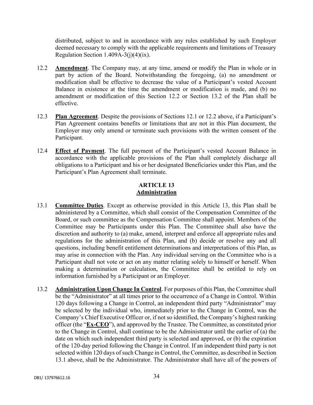 DB1/ 137976612.16 34 distributed, subject to and in accordance with any rules established by such Employer deemed necessary to comply with the applicable requirements and limitations of Treasury Regulation Section 1.409A-3(j)(4)(ix). 12.2 Amendment. The Company may, at any time, amend or modify the Plan in whole or in part by action of the Board. Notwithstanding the foregoing, (a) no amendment or modification shall be effective to decrease the value of a Participant’s vested Account Balance in existence at the time the amendment or modification is made, and (b) no amendment or modification of this Section 12.2 or Section 13.2 of the Plan shall be effective. 12.3 Plan Agreement. Despite the provisions of Sections 12.1 or 12.2 above, if a Participant’s Plan Agreement contains benefits or limitations that are not in this Plan document, the Employer may only amend or terminate such provisions with the written consent of the Participant. 12.4 Effect of Payment. The full payment of the Participant’s vested Account Balance in accordance with the applicable provisions of the Plan shall completely discharge all obligations to a Participant and his or her designated Beneficiaries under this Plan, and the Participant’s Plan Agreement shall terminate. ARTICLE 13 Administration 13.1 Committee Duties. Except as otherwise provided in this Article 13, this Plan shall be administered by a Committee, which shall consist of the Compensation Committee of the Board, or such committee as the Compensation Committee shall appoint. Members of the Committee may be Participants under this Plan. The Committee shall also have the discretion and authority to (a) make, amend, interpret and enforce all appropriate rules and regulations for the administration of this Plan, and (b) decide or resolve any and all questions, including benefit entitlement determinations and interpretations of this Plan, as may arise in connection with the Plan. Any individual serving on the Committee who is a Participant shall not vote or act on any matter relating solely to himself or herself. When making a determination or calculation, the Committee shall be entitled to rely on information furnished by a Participant or an Employer. 13.2 Administration Upon Change In Control. For purposes of this Plan, the Committee shall be the “Administrator” at all times prior to the occurrence of a Change in Control. Within 120 days following a Change in Control, an independent third party “Administrator” may be selected by the individual who, immediately prior to the Change in Control, was the Company’s Chief Executive Officer or, if not so identified, the Company’s highest ranking officer (the “Ex-CEO”), and approved by the Trustee. The Committee, as constituted prior to the Change in Control, shall continue to be the Administrator until the earlier of (a) the date on which such independent third party is selected and approved, or (b) the expiration of the 120-day period following the Change in Control. If an independent third party is not selected within 120 days of such Change in Control, the Committee, as described in Section 13.1 above, shall be the Administrator. The Administrator shall have all of the powers of