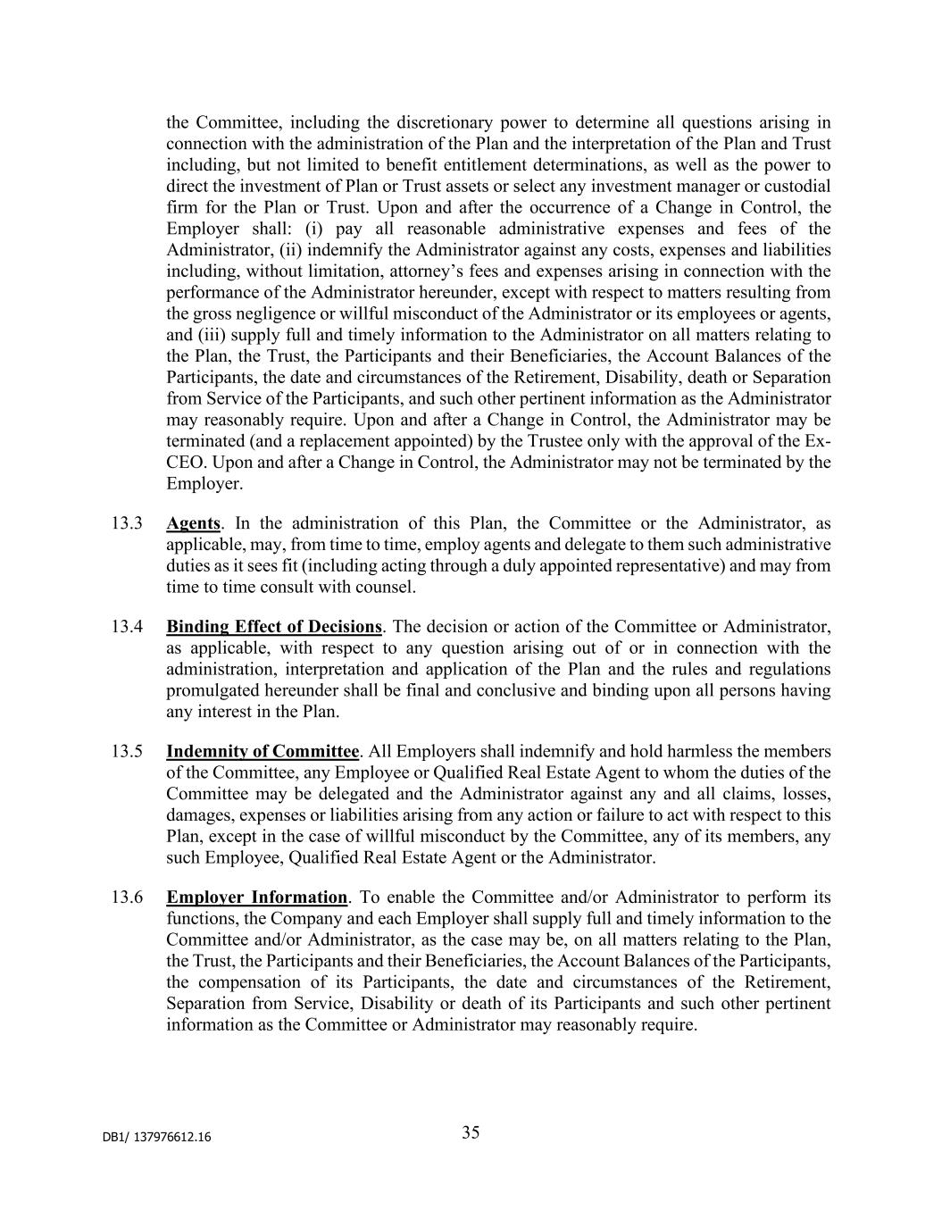 DB1/ 137976612.16 35 the Committee, including the discretionary power to determine all questions arising in connection with the administration of the Plan and the interpretation of the Plan and Trust including, but not limited to benefit entitlement determinations, as well as the power to direct the investment of Plan or Trust assets or select any investment manager or custodial firm for the Plan or Trust. Upon and after the occurrence of a Change in Control, the Employer shall: (i) pay all reasonable administrative expenses and fees of the Administrator, (ii) indemnify the Administrator against any costs, expenses and liabilities including, without limitation, attorney’s fees and expenses arising in connection with the performance of the Administrator hereunder, except with respect to matters resulting from the gross negligence or willful misconduct of the Administrator or its employees or agents, and (iii) supply full and timely information to the Administrator on all matters relating to the Plan, the Trust, the Participants and their Beneficiaries, the Account Balances of the Participants, the date and circumstances of the Retirement, Disability, death or Separation from Service of the Participants, and such other pertinent information as the Administrator may reasonably require. Upon and after a Change in Control, the Administrator may be terminated (and a replacement appointed) by the Trustee only with the approval of the Ex- CEO. Upon and after a Change in Control, the Administrator may not be terminated by the Employer. 13.3 Agents. In the administration of this Plan, the Committee or the Administrator, as applicable, may, from time to time, employ agents and delegate to them such administrative duties as it sees fit (including acting through a duly appointed representative) and may from time to time consult with counsel. 13.4 Binding Effect of Decisions. The decision or action of the Committee or Administrator, as applicable, with respect to any question arising out of or in connection with the administration, interpretation and application of the Plan and the rules and regulations promulgated hereunder shall be final and conclusive and binding upon all persons having any interest in the Plan. 13.5 Indemnity of Committee. All Employers shall indemnify and hold harmless the members of the Committee, any Employee or Qualified Real Estate Agent to whom the duties of the Committee may be delegated and the Administrator against any and all claims, losses, damages, expenses or liabilities arising from any action or failure to act with respect to this Plan, except in the case of willful misconduct by the Committee, any of its members, any such Employee, Qualified Real Estate Agent or the Administrator. 13.6 Employer Information. To enable the Committee and/or Administrator to perform its functions, the Company and each Employer shall supply full and timely information to the Committee and/or Administrator, as the case may be, on all matters relating to the Plan, the Trust, the Participants and their Beneficiaries, the Account Balances of the Participants, the compensation of its Participants, the date and circumstances of the Retirement, Separation from Service, Disability or death of its Participants and such other pertinent information as the Committee or Administrator may reasonably require.