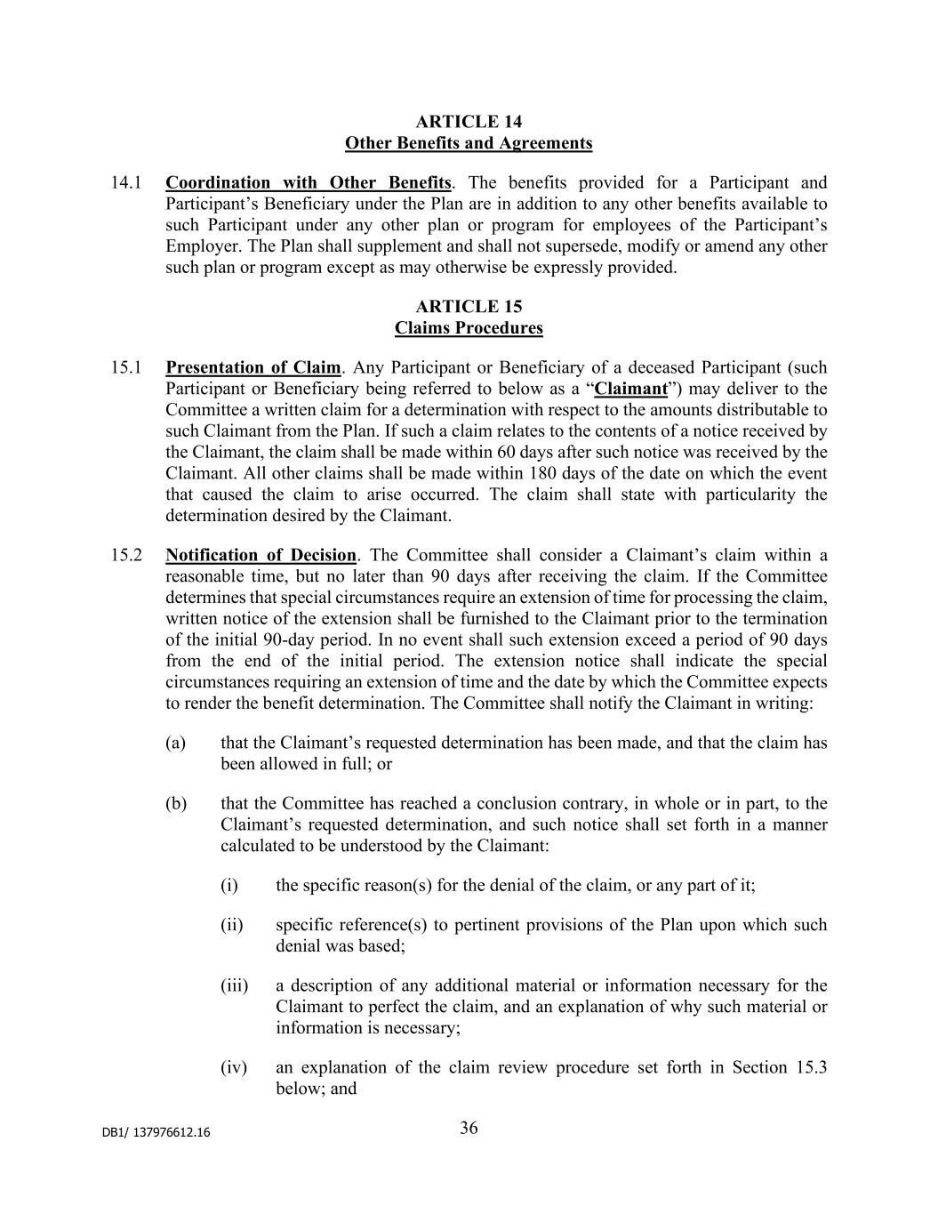 DB1/ 137976612.16 36 ARTICLE 14 Other Benefits and Agreements 14.1 Coordination with Other Benefits. The benefits provided for a Participant and Participant’s Beneficiary under the Plan are in addition to any other benefits available to such Participant under any other plan or program for employees of the Participant’s Employer. The Plan shall supplement and shall not supersede, modify or amend any other such plan or program except as may otherwise be expressly provided. ARTICLE 15 Claims Procedures 15.1 Presentation of Claim. Any Participant or Beneficiary of a deceased Participant (such Participant or Beneficiary being referred to below as a “Claimant”) may deliver to the Committee a written claim for a determination with respect to the amounts distributable to such Claimant from the Plan. If such a claim relates to the contents of a notice received by the Claimant, the claim shall be made within 60 days after such notice was received by the Claimant. All other claims shall be made within 180 days of the date on which the event that caused the claim to arise occurred. The claim shall state with particularity the determination desired by the Claimant. 15.2 Notification of Decision. The Committee shall consider a Claimant’s claim within a reasonable time, but no later than 90 days after receiving the claim. If the Committee determines that special circumstances require an extension of time for processing the claim, written notice of the extension shall be furnished to the Claimant prior to the termination of the initial 90-day period. In no event shall such extension exceed a period of 90 days from the end of the initial period. The extension notice shall indicate the special circumstances requiring an extension of time and the date by which the Committee expects to render the benefit determination. The Committee shall notify the Claimant in writing: (a) that the Claimant’s requested determination has been made, and that the claim has been allowed in full; or (b) that the Committee has reached a conclusion contrary, in whole or in part, to the Claimant’s requested determination, and such notice shall set forth in a manner calculated to be understood by the Claimant: (i) the specific reason(s) for the denial of the claim, or any part of it; (ii) specific reference(s) to pertinent provisions of the Plan upon which such denial was based; (iii) a description of any additional material or information necessary for the Claimant to perfect the claim, and an explanation of why such material or information is necessary; (iv) an explanation of the claim review procedure set forth in Section 15.3 below; and