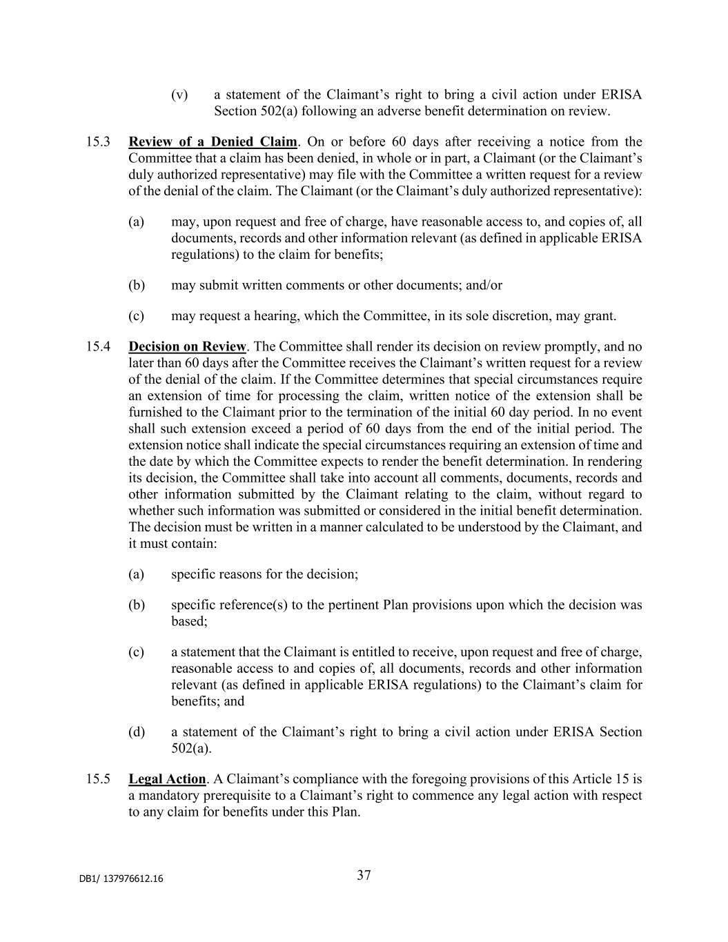 DB1/ 137976612.16 37 (v) a statement of the Claimant’s right to bring a civil action under ERISA Section 502(a) following an adverse benefit determination on review. 15.3 Review of a Denied Claim. On or before 60 days after receiving a notice from the Committee that a claim has been denied, in whole or in part, a Claimant (or the Claimant’s duly authorized representative) may file with the Committee a written request for a review of the denial of the claim. The Claimant (or the Claimant’s duly authorized representative): (a) may, upon request and free of charge, have reasonable access to, and copies of, all documents, records and other information relevant (as defined in applicable ERISA regulations) to the claim for benefits; (b) may submit written comments or other documents; and/or (c) may request a hearing, which the Committee, in its sole discretion, may grant. 15.4 Decision on Review. The Committee shall render its decision on review promptly, and no later than 60 days after the Committee receives the Claimant’s written request for a review of the denial of the claim. If the Committee determines that special circumstances require an extension of time for processing the claim, written notice of the extension shall be furnished to the Claimant prior to the termination of the initial 60 day period. In no event shall such extension exceed a period of 60 days from the end of the initial period. The extension notice shall indicate the special circumstances requiring an extension of time and the date by which the Committee expects to render the benefit determination. In rendering its decision, the Committee shall take into account all comments, documents, records and other information submitted by the Claimant relating to the claim, without regard to whether such information was submitted or considered in the initial benefit determination. The decision must be written in a manner calculated to be understood by the Claimant, and it must contain: (a) specific reasons for the decision; (b) specific reference(s) to the pertinent Plan provisions upon which the decision was based; (c) a statement that the Claimant is entitled to receive, upon request and free of charge, reasonable access to and copies of, all documents, records and other information relevant (as defined in applicable ERISA regulations) to the Claimant’s claim for benefits; and (d) a statement of the Claimant’s right to bring a civil action under ERISA Section 502(a). 15.5 Legal Action. A Claimant’s compliance with the foregoing provisions of this Article 15 is a mandatory prerequisite to a Claimant’s right to commence any legal action with respect to any claim for benefits under this Plan.