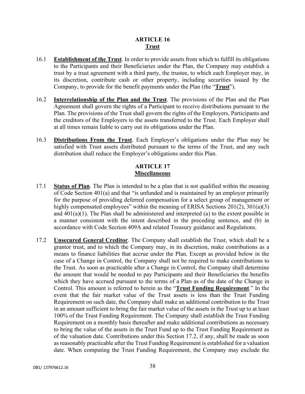 DB1/ 137976612.16 38 ARTICLE 16 Trust 16.1 Establishment of the Trust. In order to provide assets from which to fulfill its obligations to the Participants and their Beneficiaries under the Plan, the Company may establish a trust by a trust agreement with a third party, the trustee, to which each Employer may, in its discretion, contribute cash or other property, including securities issued by the Company, to provide for the benefit payments under the Plan (the “Trust”). 16.2 Interrelationship of the Plan and the Trust. The provisions of the Plan and the Plan Agreement shall govern the rights of a Participant to receive distributions pursuant to the Plan. The provisions of the Trust shall govern the rights of the Employers, Participants and the creditors of the Employers to the assets transferred to the Trust. Each Employer shall at all times remain liable to carry out its obligations under the Plan. 16.3 Distributions From the Trust. Each Employer’s obligations under the Plan may be satisfied with Trust assets distributed pursuant to the terms of the Trust, and any such distribution shall reduce the Employer’s obligations under this Plan. ARTICLE 17 Miscellaneous 17.1 Status of Plan. The Plan is intended to be a plan that is not qualified within the meaning of Code Section 401(a) and that “is unfunded and is maintained by an employer primarily for the purpose of providing deferred compensation for a select group of management or highly compensated employees” within the meaning of ERISA Sections 201(2), 301(a)(3) and 401(a)(1). The Plan shall be administered and interpreted (a) to the extent possible in a manner consistent with the intent described in the preceding sentence, and (b) in accordance with Code Section 409A and related Treasury guidance and Regulations. 17.2 Unsecured General Creditor. The Company shall establish the Trust, which shall be a grantor trust, and to which the Company may, in its discretion, make contributions as a means to finance liabilities that accrue under the Plan. Except as provided below in the case of a Change in Control, the Company shall not be required to make contributions to the Trust. As soon as practicable after a Change in Control, the Company shall determine the amount that would be needed to pay Participants and their Beneficiaries the benefits which they have accrued pursuant to the terms of a Plan as of the date of the Change in Control. This amount is referred to herein as the “Trust Funding Requirement.” In the event that the fair market value of the Trust assets is less than the Trust Funding Requirement on such date, the Company shall make an additional contribution to the Trust in an amount sufficient to bring the fair market value of the assets in the Trust up to at least 100% of the Trust Funding Requirement. The Company shall establish the Trust Funding Requirement on a monthly basis thereafter and make additional contributions as necessary to bring the value of the assets in the Trust Fund up to the Trust Funding Requirement as of the valuation date. Contributions under this Section 17.2, if any, shall be made as soon as reasonably practicable after the Trust Funding Requirement is established for a valuation date. When computing the Trust Funding Requirement, the Company may exclude the