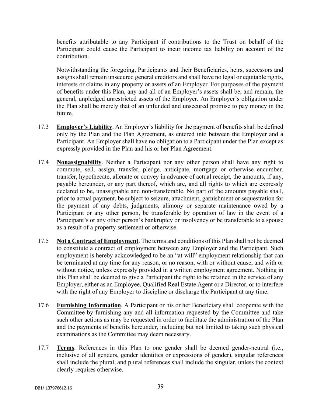DB1/ 137976612.16 39 benefits attributable to any Participant if contributions to the Trust on behalf of the Participant could cause the Participant to incur income tax liability on account of the contribution. Notwithstanding the foregoing, Participants and their Beneficiaries, heirs, successors and assigns shall remain unsecured general creditors and shall have no legal or equitable rights, interests or claims in any property or assets of an Employer. For purposes of the payment of benefits under this Plan, any and all of an Employer’s assets shall be, and remain, the general, unpledged unrestricted assets of the Employer. An Employer’s obligation under the Plan shall be merely that of an unfunded and unsecured promise to pay money in the future. 17.3 Employer’s Liability. An Employer’s liability for the payment of benefits shall be defined only by the Plan and the Plan Agreement, as entered into between the Employer and a Participant. An Employer shall have no obligation to a Participant under the Plan except as expressly provided in the Plan and his or her Plan Agreement. 17.4 Nonassignability. Neither a Participant nor any other person shall have any right to commute, sell, assign, transfer, pledge, anticipate, mortgage or otherwise encumber, transfer, hypothecate, alienate or convey in advance of actual receipt, the amounts, if any, payable hereunder, or any part thereof, which are, and all rights to which are expressly declared to be, unassignable and non-transferable. No part of the amounts payable shall, prior to actual payment, be subject to seizure, attachment, garnishment or sequestration for the payment of any debts, judgments, alimony or separate maintenance owed by a Participant or any other person, be transferable by operation of law in the event of a Participant’s or any other person’s bankruptcy or insolvency or be transferable to a spouse as a result of a property settlement or otherwise. 17.5 Not a Contract of Employment. The terms and conditions of this Plan shall not be deemed to constitute a contract of employment between any Employer and the Participant. Such employment is hereby acknowledged to be an “at will” employment relationship that can be terminated at any time for any reason, or no reason, with or without cause, and with or without notice, unless expressly provided in a written employment agreement. Nothing in this Plan shall be deemed to give a Participant the right to be retained in the service of any Employer, either as an Employee, Qualified Real Estate Agent or a Director, or to interfere with the right of any Employer to discipline or discharge the Participant at any time. 17.6 Furnishing Information. A Participant or his or her Beneficiary shall cooperate with the Committee by furnishing any and all information requested by the Committee and take such other actions as may be requested in order to facilitate the administration of the Plan and the payments of benefits hereunder, including but not limited to taking such physical examinations as the Committee may deem necessary. 17.7 Terms. References in this Plan to one gender shall be deemed gender-neutral (i.e., inclusive of all genders, gender identities or expressions of gender), singular references shall include the plural, and plural references shall include the singular, unless the context clearly requires otherwise.