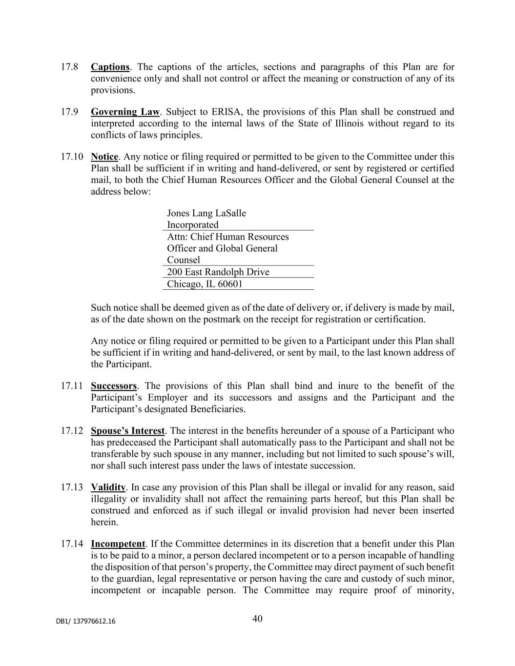 DB1/ 137976612.16 40 17.8 Captions. The captions of the articles, sections and paragraphs of this Plan are for convenience only and shall not control or affect the meaning or construction of any of its provisions. 17.9 Governing Law. Subject to ERISA, the provisions of this Plan shall be construed and interpreted according to the internal laws of the State of Illinois without regard to its conflicts of laws principles. 17.10 Notice. Any notice or filing required or permitted to be given to the Committee under this Plan shall be sufficient if in writing and hand-delivered, or sent by registered or certified mail, to both the Chief Human Resources Officer and the Global General Counsel at the address below: Jones Lang LaSalle Incorporated Attn: Chief Human Resources Officer and Global General Counsel 200 East Randolph Drive Chicago, IL 60601 Such notice shall be deemed given as of the date of delivery or, if delivery is made by mail, as of the date shown on the postmark on the receipt for registration or certification. Any notice or filing required or permitted to be given to a Participant under this Plan shall be sufficient if in writing and hand-delivered, or sent by mail, to the last known address of the Participant. 17.11 Successors. The provisions of this Plan shall bind and inure to the benefit of the Participant’s Employer and its successors and assigns and the Participant and the Participant’s designated Beneficiaries. 17.12 Spouse’s Interest. The interest in the benefits hereunder of a spouse of a Participant who has predeceased the Participant shall automatically pass to the Participant and shall not be transferable by such spouse in any manner, including but not limited to such spouse’s will, nor shall such interest pass under the laws of intestate succession. 17.13 Validity. In case any provision of this Plan shall be illegal or invalid for any reason, said illegality or invalidity shall not affect the remaining parts hereof, but this Plan shall be construed and enforced as if such illegal or invalid provision had never been inserted herein. 17.14 Incompetent. If the Committee determines in its discretion that a benefit under this Plan is to be paid to a minor, a person declared incompetent or to a person incapable of handling the disposition of that person’s property, the Committee may direct payment of such benefit to the guardian, legal representative or person having the care and custody of such minor, incompetent or incapable person. The Committee may require proof of minority,
