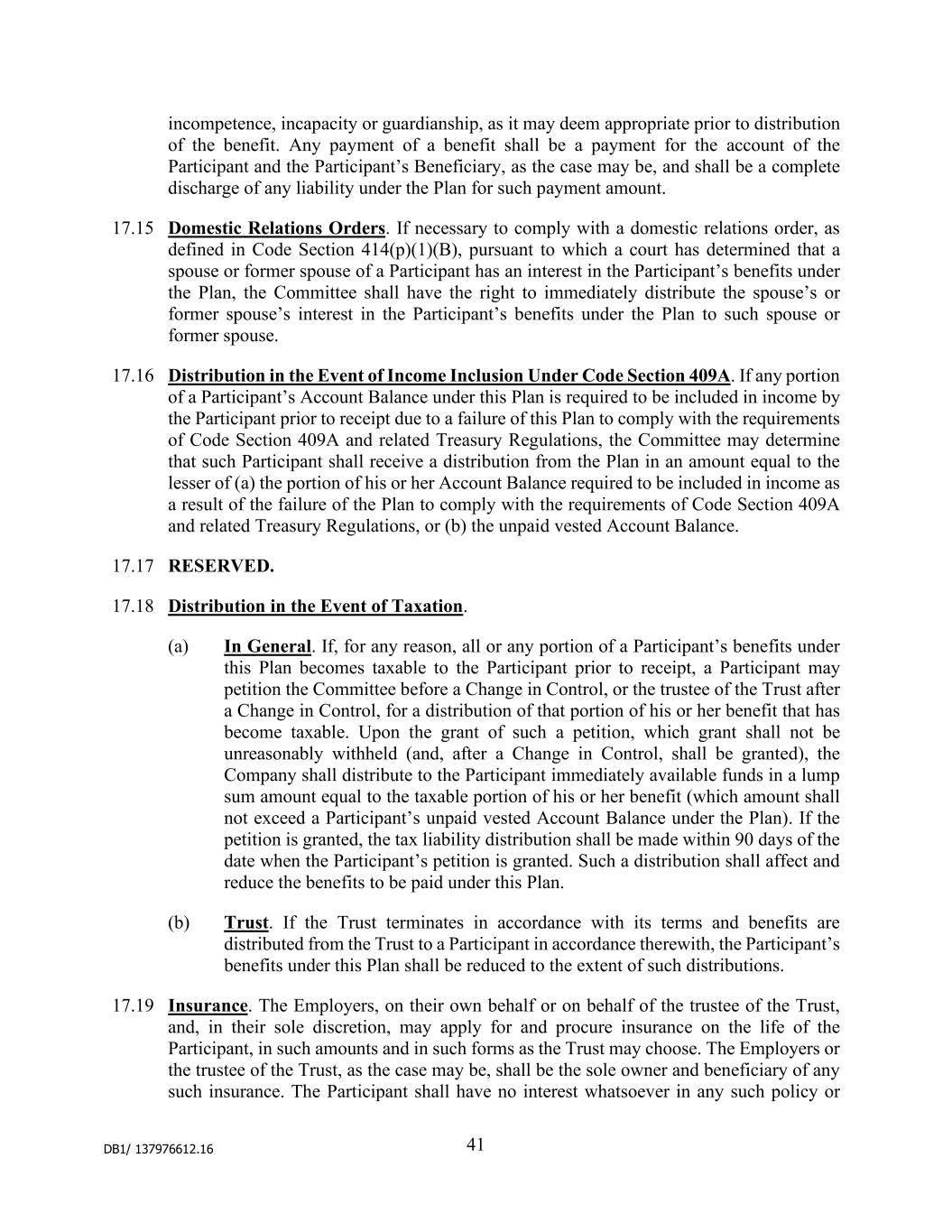 DB1/ 137976612.16 41 incompetence, incapacity or guardianship, as it may deem appropriate prior to distribution of the benefit. Any payment of a benefit shall be a payment for the account of the Participant and the Participant’s Beneficiary, as the case may be, and shall be a complete discharge of any liability under the Plan for such payment amount. 17.15 Domestic Relations Orders. If necessary to comply with a domestic relations order, as defined in Code Section 414(p)(1)(B), pursuant to which a court has determined that a spouse or former spouse of a Participant has an interest in the Participant’s benefits under the Plan, the Committee shall have the right to immediately distribute the spouse’s or former spouse’s interest in the Participant’s benefits under the Plan to such spouse or former spouse. 17.16 Distribution in the Event of Income Inclusion Under Code Section 409A. If any portion of a Participant’s Account Balance under this Plan is required to be included in income by the Participant prior to receipt due to a failure of this Plan to comply with the requirements of Code Section 409A and related Treasury Regulations, the Committee may determine that such Participant shall receive a distribution from the Plan in an amount equal to the lesser of (a) the portion of his or her Account Balance required to be included in income as a result of the failure of the Plan to comply with the requirements of Code Section 409A and related Treasury Regulations, or (b) the unpaid vested Account Balance. 17.17 RESERVED. 17.18 Distribution in the Event of Taxation. (a) In General. If, for any reason, all or any portion of a Participant’s benefits under this Plan becomes taxable to the Participant prior to receipt, a Participant may petition the Committee before a Change in Control, or the trustee of the Trust after a Change in Control, for a distribution of that portion of his or her benefit that has become taxable. Upon the grant of such a petition, which grant shall not be unreasonably withheld (and, after a Change in Control, shall be granted), the Company shall distribute to the Participant immediately available funds in a lump sum amount equal to the taxable portion of his or her benefit (which amount shall not exceed a Participant’s unpaid vested Account Balance under the Plan). If the petition is granted, the tax liability distribution shall be made within 90 days of the date when the Participant’s petition is granted. Such a distribution shall affect and reduce the benefits to be paid under this Plan. (b) Trust. If the Trust terminates in accordance with its terms and benefits are distributed from the Trust to a Participant in accordance therewith, the Participant’s benefits under this Plan shall be reduced to the extent of such distributions. 17.19 Insurance. The Employers, on their own behalf or on behalf of the trustee of the Trust, and, in their sole discretion, may apply for and procure insurance on the life of the Participant, in such amounts and in such forms as the Trust may choose. The Employers or the trustee of the Trust, as the case may be, shall be the sole owner and beneficiary of any such insurance. The Participant shall have no interest whatsoever in any such policy or