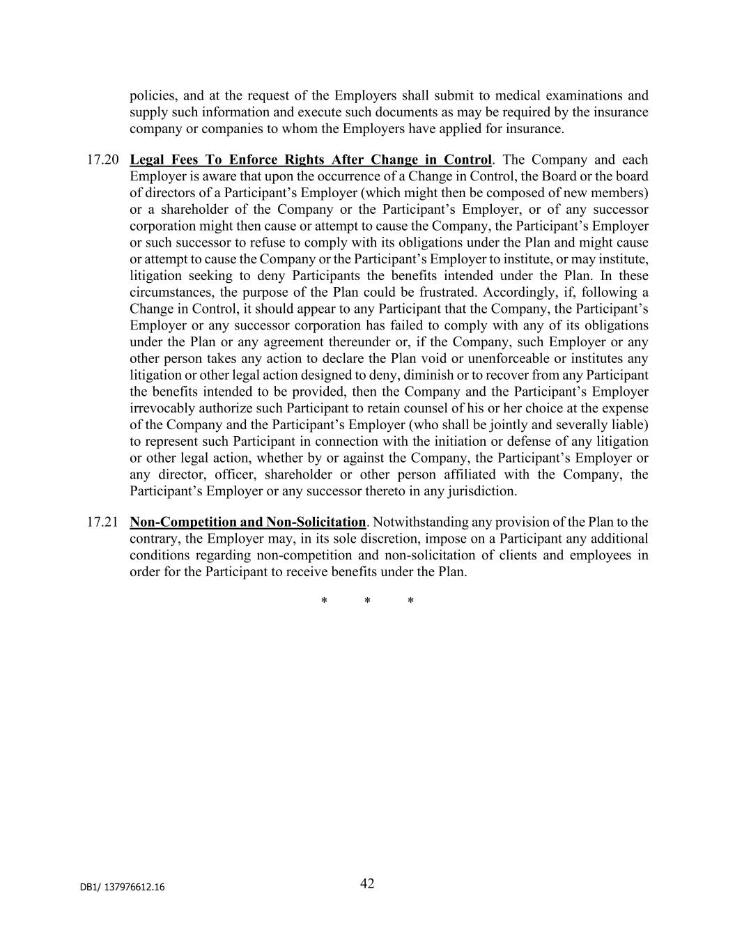 DB1/ 137976612.16 42 policies, and at the request of the Employers shall submit to medical examinations and supply such information and execute such documents as may be required by the insurance company or companies to whom the Employers have applied for insurance. 17.20 Legal Fees To Enforce Rights After Change in Control. The Company and each Employer is aware that upon the occurrence of a Change in Control, the Board or the board of directors of a Participant’s Employer (which might then be composed of new members) or a shareholder of the Company or the Participant’s Employer, or of any successor corporation might then cause or attempt to cause the Company, the Participant’s Employer or such successor to refuse to comply with its obligations under the Plan and might cause or attempt to cause the Company or the Participant’s Employer to institute, or may institute, litigation seeking to deny Participants the benefits intended under the Plan. In these circumstances, the purpose of the Plan could be frustrated. Accordingly, if, following a Change in Control, it should appear to any Participant that the Company, the Participant’s Employer or any successor corporation has failed to comply with any of its obligations under the Plan or any agreement thereunder or, if the Company, such Employer or any other person takes any action to declare the Plan void or unenforceable or institutes any litigation or other legal action designed to deny, diminish or to recover from any Participant the benefits intended to be provided, then the Company and the Participant’s Employer irrevocably authorize such Participant to retain counsel of his or her choice at the expense of the Company and the Participant’s Employer (who shall be jointly and severally liable) to represent such Participant in connection with the initiation or defense of any litigation or other legal action, whether by or against the Company, the Participant’s Employer or any director, officer, shareholder or other person affiliated with the Company, the Participant’s Employer or any successor thereto in any jurisdiction. 17.21 Non-Competition and Non-Solicitation. Notwithstanding any provision of the Plan to the contrary, the Employer may, in its sole discretion, impose on a Participant any additional conditions regarding non-competition and non-solicitation of clients and employees in order for the Participant to receive benefits under the Plan. * * *