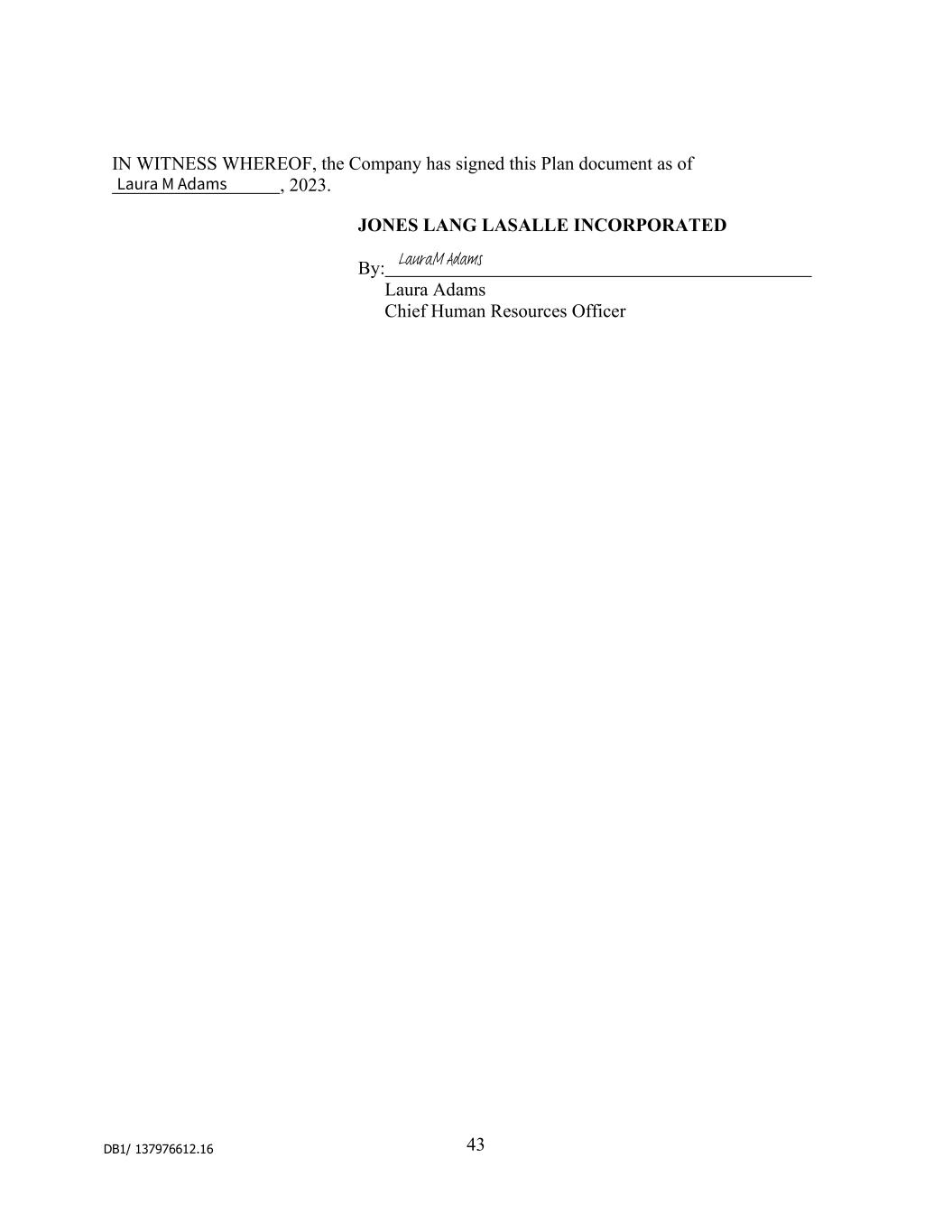 DB1/ 137976612.16 43 IN WITNESS WHEREOF, the Company has signed this Plan document as of , 2023. JONES LANG LASALLE INCORPORATED By: Laura Adams Chief Human Resources Officer LauraM Adams Laura M Adams