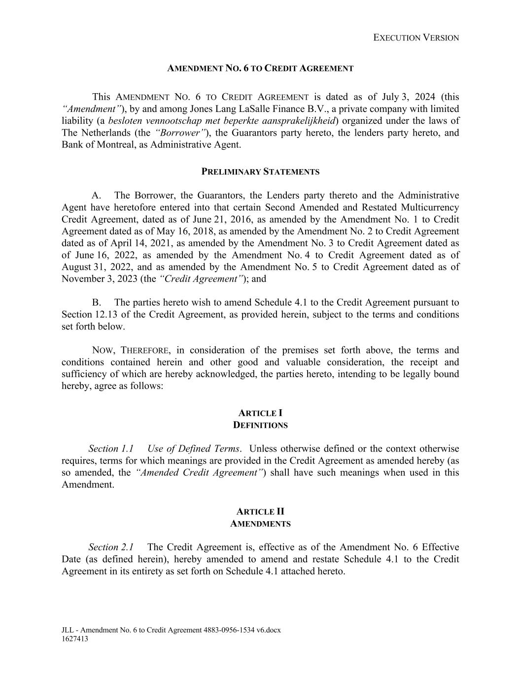 EXECUTION VERSION JLL - Amendment No. 6 to Credit Agreement 4883-0956-1534 v6.docx 1627413 AMENDMENT NO. 6 TO CREDIT AGREEMENT This AMENDMENT NO. 6 TO CREDIT AGREEMENT is dated as of July 3, 2024 (this “Amendment”), by and among Jones Lang LaSalle Finance B.V., a private company with limited liability (a besloten vennootschap met beperkte aansprakelijkheid) organized under the laws of The Netherlands (the “Borrower”), the Guarantors party hereto, the lenders party hereto, and Bank of Montreal, as Administrative Agent. PRELIMINARY STATEMENTS A. The Borrower, the Guarantors, the Lenders party thereto and the Administrative Agent have heretofore entered into that certain Second Amended and Restated Multicurrency Credit Agreement, dated as of June 21, 2016, as amended by the Amendment No. 1 to Credit Agreement dated as of May 16, 2018, as amended by the Amendment No. 2 to Credit Agreement dated as of April 14, 2021, as amended by the Amendment No. 3 to Credit Agreement dated as of June 16, 2022, as amended by the Amendment No. 4 to Credit Agreement dated as of August 31, 2022, and as amended by the Amendment No. 5 to Credit Agreement dated as of November 3, 2023 (the “Credit Agreement”); and B. The parties hereto wish to amend Schedule 4.1 to the Credit Agreement pursuant to Section 12.13 of the Credit Agreement, as provided herein, subject to the terms and conditions set forth below. NOW, THEREFORE, in consideration of the premises set forth above, the terms and conditions contained herein and other good and valuable consideration, the receipt and sufficiency of which are hereby acknowledged, the parties hereto, intending to be legally bound hereby, agree as follows: ARTICLE I DEFINITIONS Section 1.1 Use of Defined Terms. Unless otherwise defined or the context otherwise requires, terms for which meanings are provided in the Credit Agreement as amended hereby (as so amended, the “Amended Credit Agreement”) shall have such meanings when used in this Amendment. ARTICLE II AMENDMENTS Section 2.1 The Credit Agreement is, effective as of the Amendment No. 6 Effective Date (as defined herein), hereby amended to amend and restate Schedule 4.1 to the Credit Agreement in its entirety as set forth on Schedule 4.1 attached hereto.