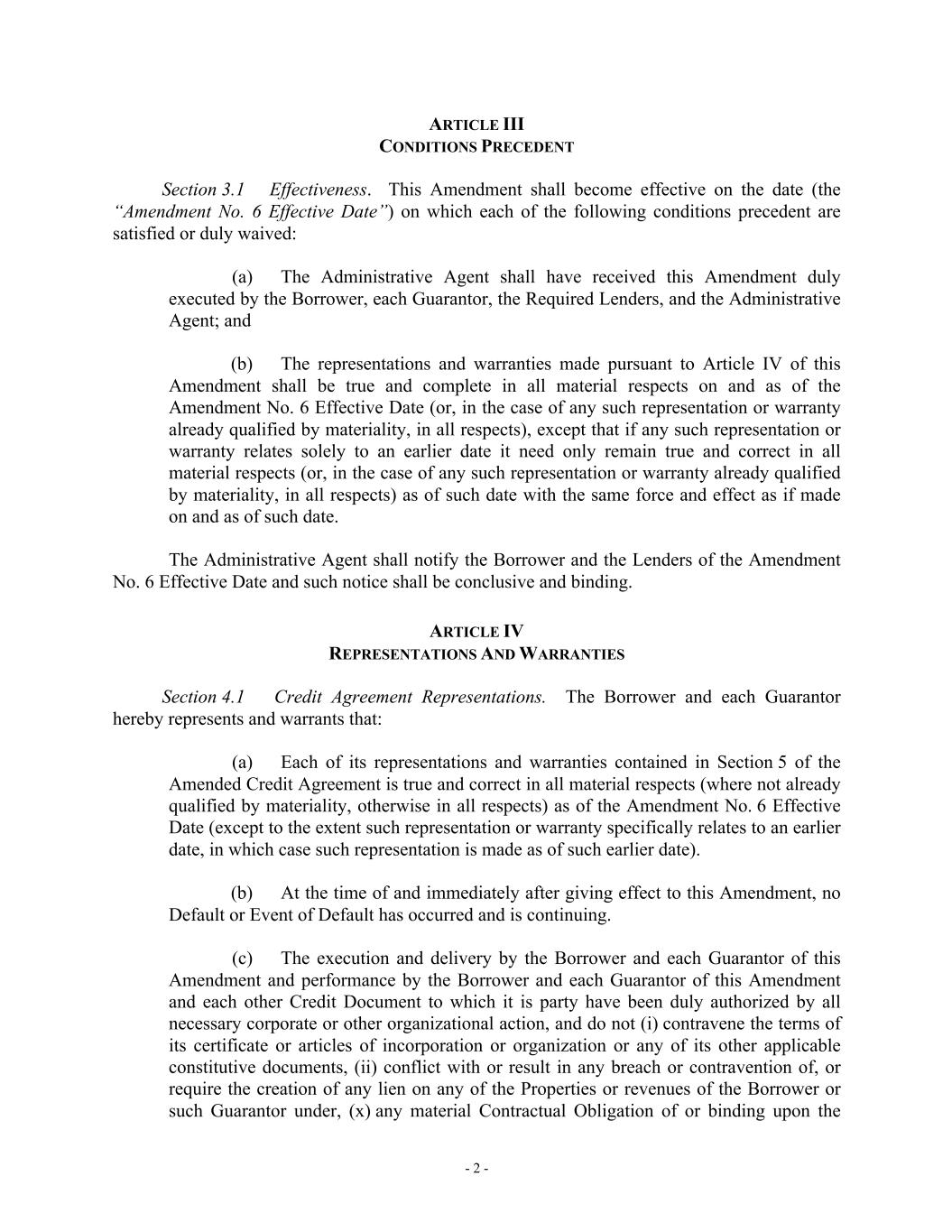 - 2 - ARTICLE III CONDITIONS PRECEDENT Section 3.1 Effectiveness. This Amendment shall become effective on the date (the “Amendment No. 6 Effective Date”) on which each of the following conditions precedent are satisfied or duly waived: (a) The Administrative Agent shall have received this Amendment duly executed by the Borrower, each Guarantor, the Required Lenders, and the Administrative Agent; and (b) The representations and warranties made pursuant to Article IV of this Amendment shall be true and complete in all material respects on and as of the Amendment No. 6 Effective Date (or, in the case of any such representation or warranty already qualified by materiality, in all respects), except that if any such representation or warranty relates solely to an earlier date it need only remain true and correct in all material respects (or, in the case of any such representation or warranty already qualified by materiality, in all respects) as of such date with the same force and effect as if made on and as of such date. The Administrative Agent shall notify the Borrower and the Lenders of the Amendment No. 6 Effective Date and such notice shall be conclusive and binding. ARTICLE IV REPRESENTATIONS AND WARRANTIES Section 4.1 Credit Agreement Representations. The Borrower and each Guarantor hereby represents and warrants that: (a) Each of its representations and warranties contained in Section 5 of the Amended Credit Agreement is true and correct in all material respects (where not already qualified by materiality, otherwise in all respects) as of the Amendment No. 6 Effective Date (except to the extent such representation or warranty specifically relates to an earlier date, in which case such representation is made as of such earlier date). (b) At the time of and immediately after giving effect to this Amendment, no Default or Event of Default has occurred and is continuing. (c) The execution and delivery by the Borrower and each Guarantor of this Amendment and performance by the Borrower and each Guarantor of this Amendment and each other Credit Document to which it is party have been duly authorized by all necessary corporate or other organizational action, and do not (i) contravene the terms of its certificate or articles of incorporation or organization or any of its other applicable constitutive documents, (ii) conflict with or result in any breach or contravention of, or require the creation of any lien on any of the Properties or revenues of the Borrower or such Guarantor under, (x) any material Contractual Obligation of or binding upon the