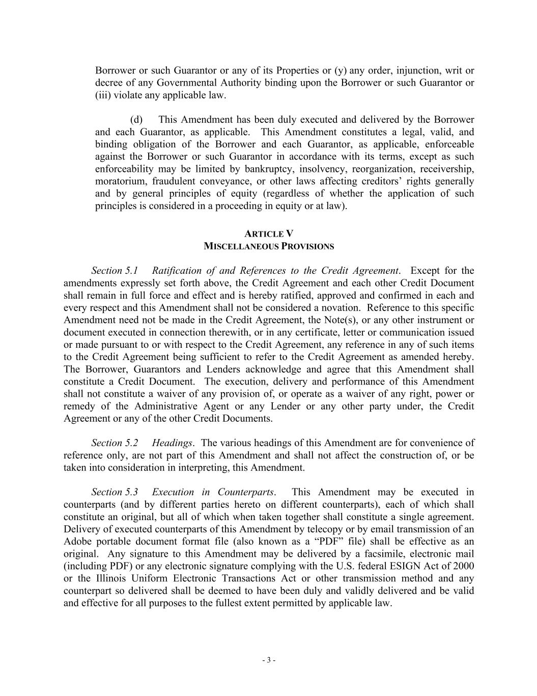 - 3 - Borrower or such Guarantor or any of its Properties or (y) any order, injunction, writ or decree of any Governmental Authority binding upon the Borrower or such Guarantor or (iii) violate any applicable law. (d) This Amendment has been duly executed and delivered by the Borrower and each Guarantor, as applicable. This Amendment constitutes a legal, valid, and binding obligation of the Borrower and each Guarantor, as applicable, enforceable against the Borrower or such Guarantor in accordance with its terms, except as such enforceability may be limited by bankruptcy, insolvency, reorganization, receivership, moratorium, fraudulent conveyance, or other laws affecting creditors’ rights generally and by general principles of equity (regardless of whether the application of such principles is considered in a proceeding in equity or at law). ARTICLE V MISCELLANEOUS PROVISIONS Section 5.1 Ratification of and References to the Credit Agreement. Except for the amendments expressly set forth above, the Credit Agreement and each other Credit Document shall remain in full force and effect and is hereby ratified, approved and confirmed in each and every respect and this Amendment shall not be considered a novation. Reference to this specific Amendment need not be made in the Credit Agreement, the Note(s), or any other instrument or document executed in connection therewith, or in any certificate, letter or communication issued or made pursuant to or with respect to the Credit Agreement, any reference in any of such items to the Credit Agreement being sufficient to refer to the Credit Agreement as amended hereby. The Borrower, Guarantors and Lenders acknowledge and agree that this Amendment shall constitute a Credit Document. The execution, delivery and performance of this Amendment shall not constitute a waiver of any provision of, or operate as a waiver of any right, power or remedy of the Administrative Agent or any Lender or any other party under, the Credit Agreement or any of the other Credit Documents. Section 5.2 Headings. The various headings of this Amendment are for convenience of reference only, are not part of this Amendment and shall not affect the construction of, or be taken into consideration in interpreting, this Amendment. Section 5.3 Execution in Counterparts. This Amendment may be executed in counterparts (and by different parties hereto on different counterparts), each of which shall constitute an original, but all of which when taken together shall constitute a single agreement. Delivery of executed counterparts of this Amendment by telecopy or by email transmission of an Adobe portable document format file (also known as a “PDF” file) shall be effective as an original. Any signature to this Amendment may be delivered by a facsimile, electronic mail (including PDF) or any electronic signature complying with the U.S. federal ESIGN Act of 2000 or the Illinois Uniform Electronic Transactions Act or other transmission method and any counterpart so delivered shall be deemed to have been duly and validly delivered and be valid and effective for all purposes to the fullest extent permitted by applicable law.