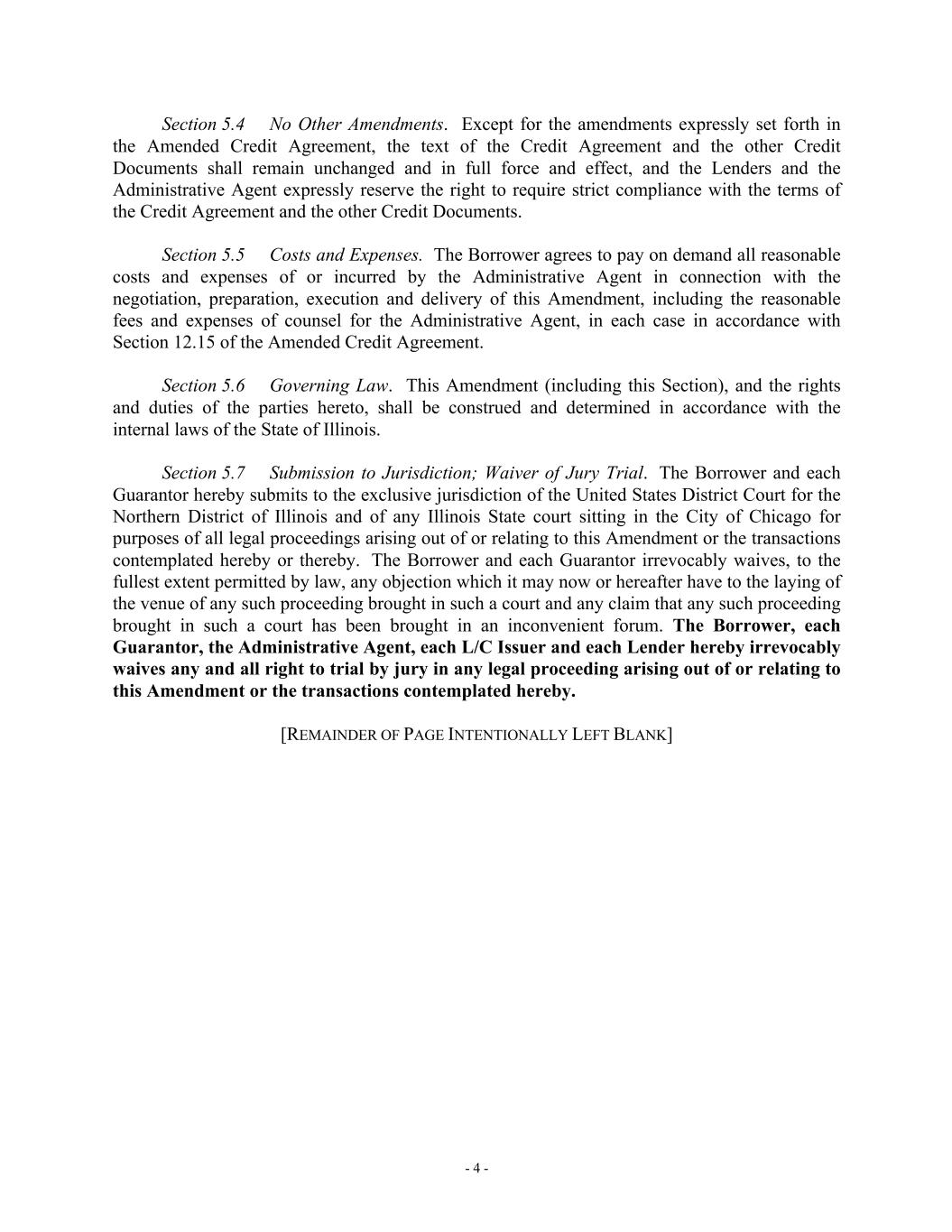 - 4 - Section 5.4 No Other Amendments. Except for the amendments expressly set forth in the Amended Credit Agreement, the text of the Credit Agreement and the other Credit Documents shall remain unchanged and in full force and effect, and the Lenders and the Administrative Agent expressly reserve the right to require strict compliance with the terms of the Credit Agreement and the other Credit Documents. Section 5.5 Costs and Expenses. The Borrower agrees to pay on demand all reasonable costs and expenses of or incurred by the Administrative Agent in connection with the negotiation, preparation, execution and delivery of this Amendment, including the reasonable fees and expenses of counsel for the Administrative Agent, in each case in accordance with Section 12.15 of the Amended Credit Agreement. Section 5.6 Governing Law. This Amendment (including this Section), and the rights and duties of the parties hereto, shall be construed and determined in accordance with the internal laws of the State of Illinois. Section 5.7 Submission to Jurisdiction; Waiver of Jury Trial. The Borrower and each Guarantor hereby submits to the exclusive jurisdiction of the United States District Court for the Northern District of Illinois and of any Illinois State court sitting in the City of Chicago for purposes of all legal proceedings arising out of or relating to this Amendment or the transactions contemplated hereby or thereby. The Borrower and each Guarantor irrevocably waives, to the fullest extent permitted by law, any objection which it may now or hereafter have to the laying of the venue of any such proceeding brought in such a court and any claim that any such proceeding brought in such a court has been brought in an inconvenient forum. The Borrower, each Guarantor, the Administrative Agent, each L/C Issuer and each Lender hereby irrevocably waives any and all right to trial by jury in any legal proceeding arising out of or relating to this Amendment or the transactions contemplated hereby. [REMAINDER OF PAGE INTENTIONALLY LEFT BLANK]