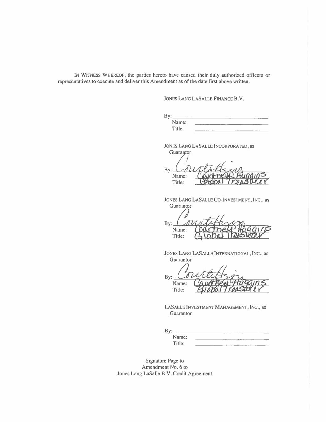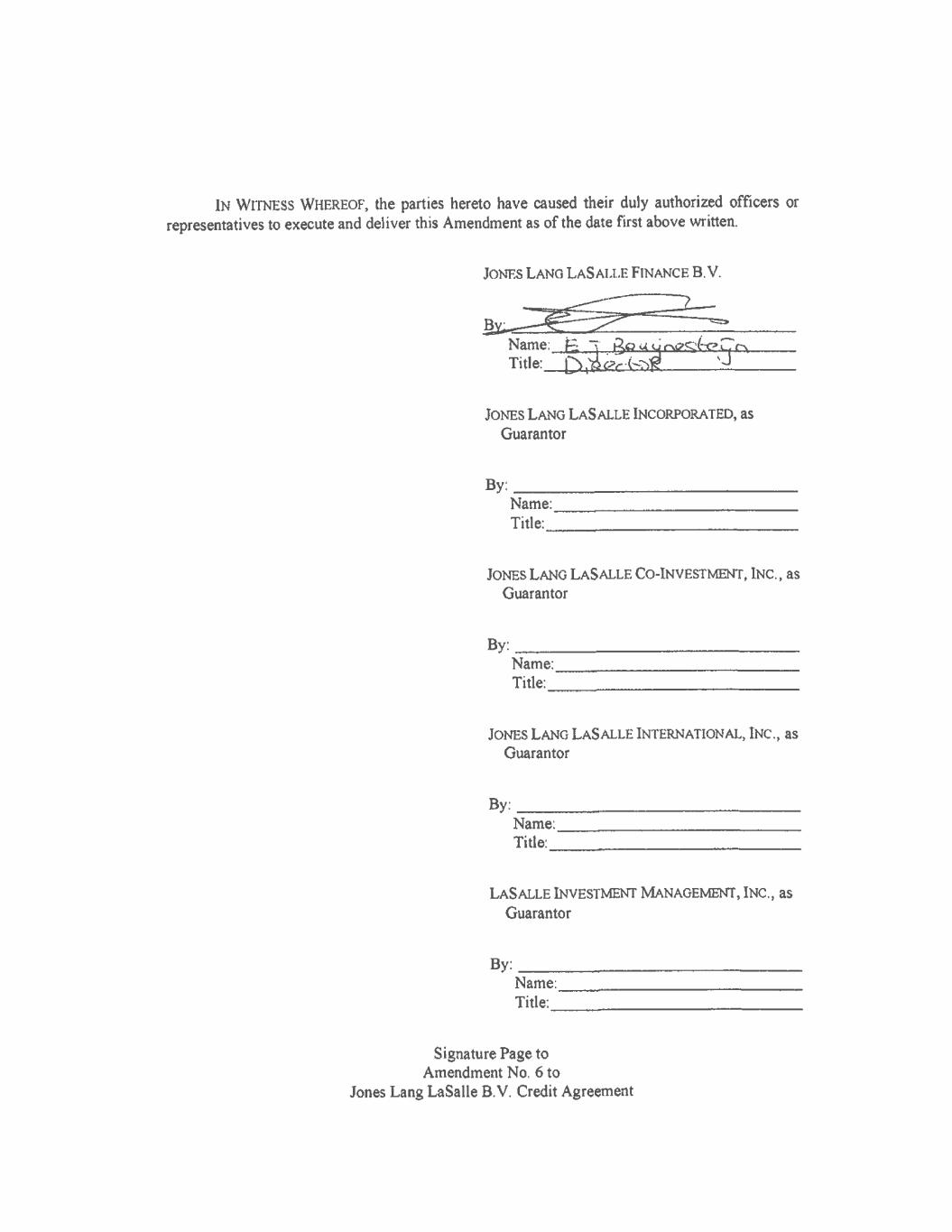 IN WITNESS WHEREOF, the parties hereto have caused their duly authorized officers or representatives to execute and deliver this Amendment as of the date first above written. JONES LANG LASALLE FINANCE B. V. Name: Title._ [> eck JONES LANG LASALLE INCORPORATED, as Guarantor By: Name: Title: JONES LANG LASALLE CO-INVESTMENT, INC., as Guarantor By: Name: Title: JONES LANG LASALLE INTERNATIONAL, INC., as Guarantor By: Name: Title: LASALLE INVESTMENT MANAGEMENT, INC., as Guarantor By: Name: Title: Signature Page to Amendment No, 6 to Jones Lang LaSalle B.V. Credit Agreement