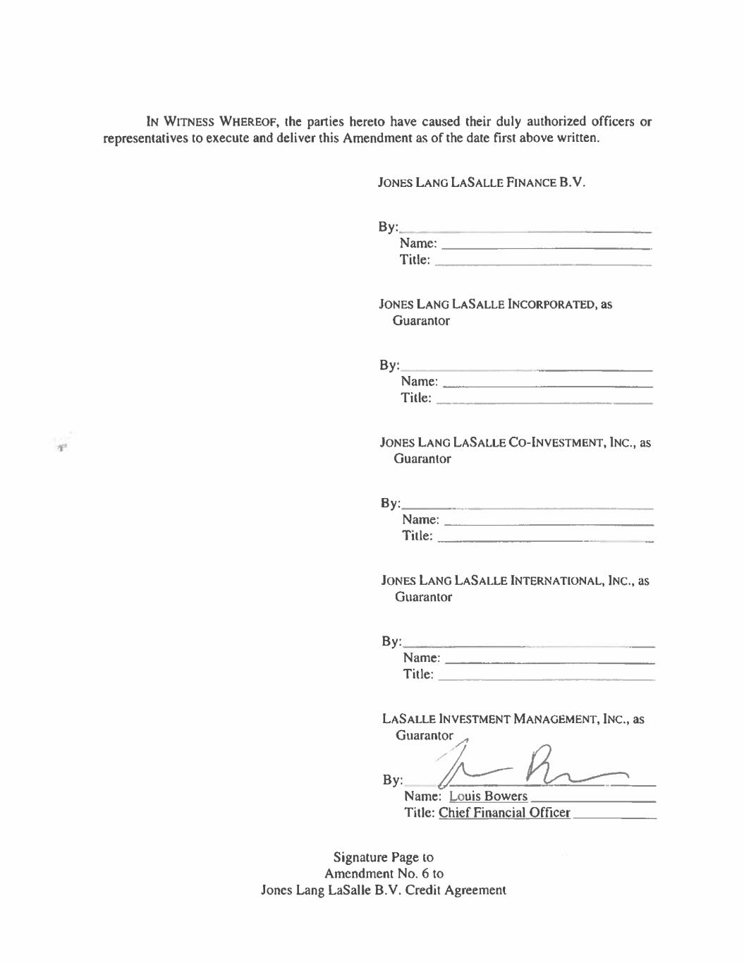 IN WITNESS WHEREOF, the parties hereto have caused their duly authorized officers or representatives to execute and deliver this Amendment as of the date first above written. JONES LANG LASALLE FINANCE B.V. By:_ Name: Title: JONES LANG LASALLE INCORPORATED, as Guarantor By: Name: Title: JONES LANG LASALLE Co-INVESTMENT, INC., as Guarantor By: Name: Title: JONES LANG LASALLE INTERNATIONAL, INC., as Guarantor By: Name: Title: LASALLE INVESTMENT MANAGEMENT, INC., as Guarantor an By: 4 Name: Louis Bowers Title: Chief Financial Officer Signature Page to Amendment No. 6 to Jones Lang LaSalle B.V. Credit Agreement