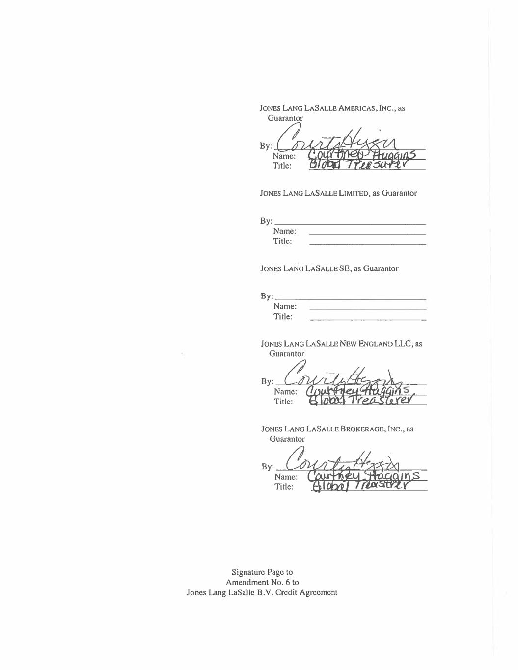 JONES LANG LASALLE AMERICAS, INC., as Guarantor By: Name: Title: JONES LANG LASALLE LIMITED, as Guarantor By: Name: Title: JONES LANG LASALLE SE, as Guarantor Tite: C€O Ovecatois ¢ Fo evntavy JONES LANG LASALLE NEW ENGLAND LLC, as Guarantor By: Name: Title: JONES LANG LASALLE BROKERAGE, INC., as Guarantor By: Name: Title: Signature Page to Amendment No. 6 to Jones Lang LaSalle B.V. Credit Agreement