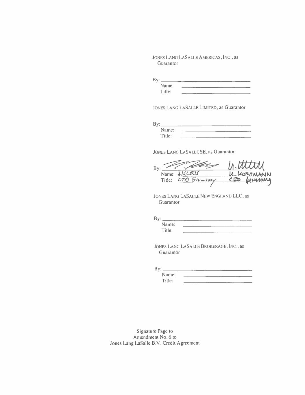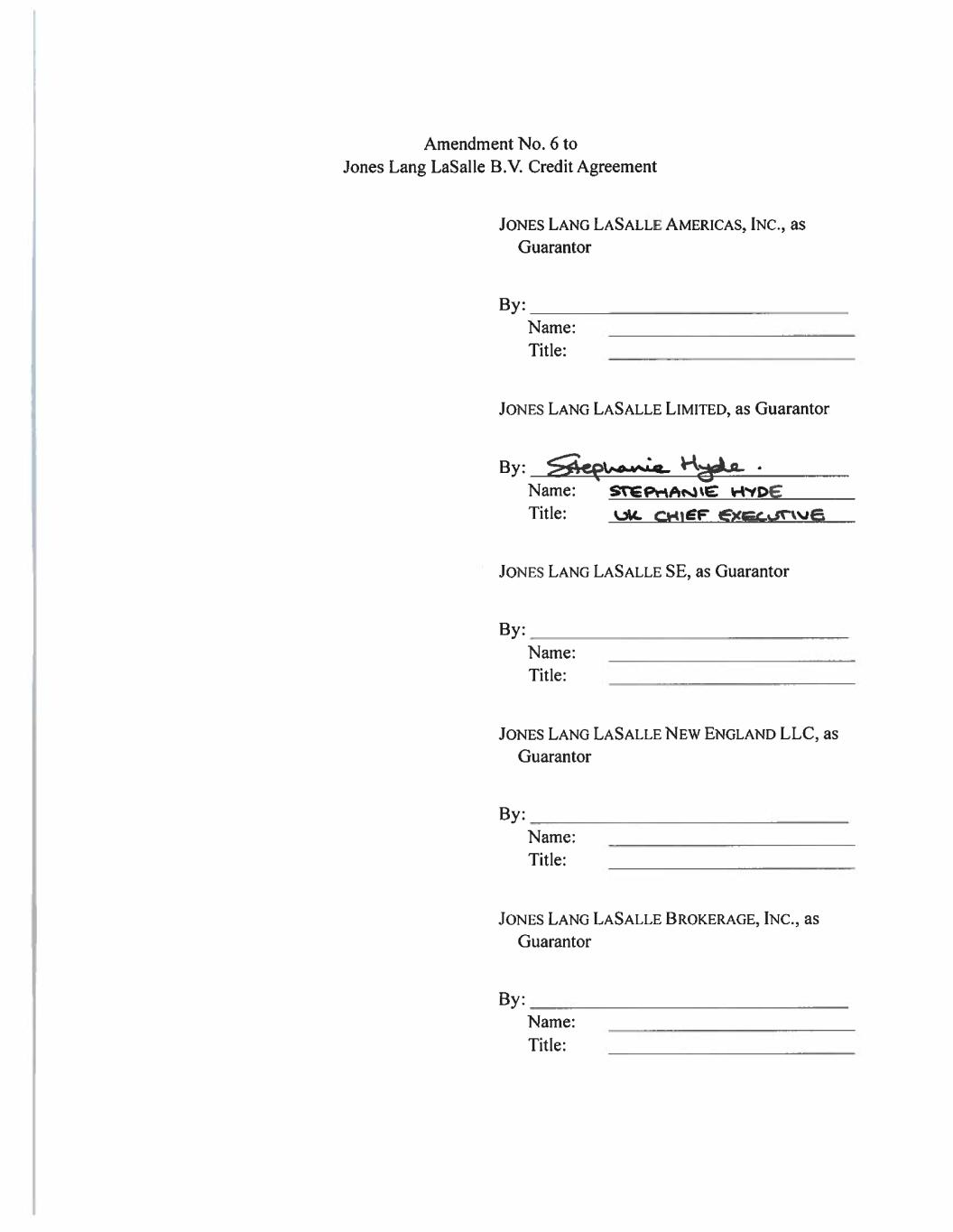 Amendment No. 6 to Jones Lang LaSalle B.V. Credit Agreement JONES LANG LASALLE AMERICAS, INC., as Guarantor By: Name: Title: JONES LANG LASALLE LIMITED, as Guarantor By: SAeprewie Hughie ; Name: STEPHANIE HYDE Title: Kk CHIE exec uTWE JONES LANG LASALLE SE, as Guarantor By: _ Name: Title: JONES LANG LASALLE NEW ENGLAND LLC, as Guarantor By: Name: Title: JONES LANG LASALLE BROKERAGE, INC., as Guarantor