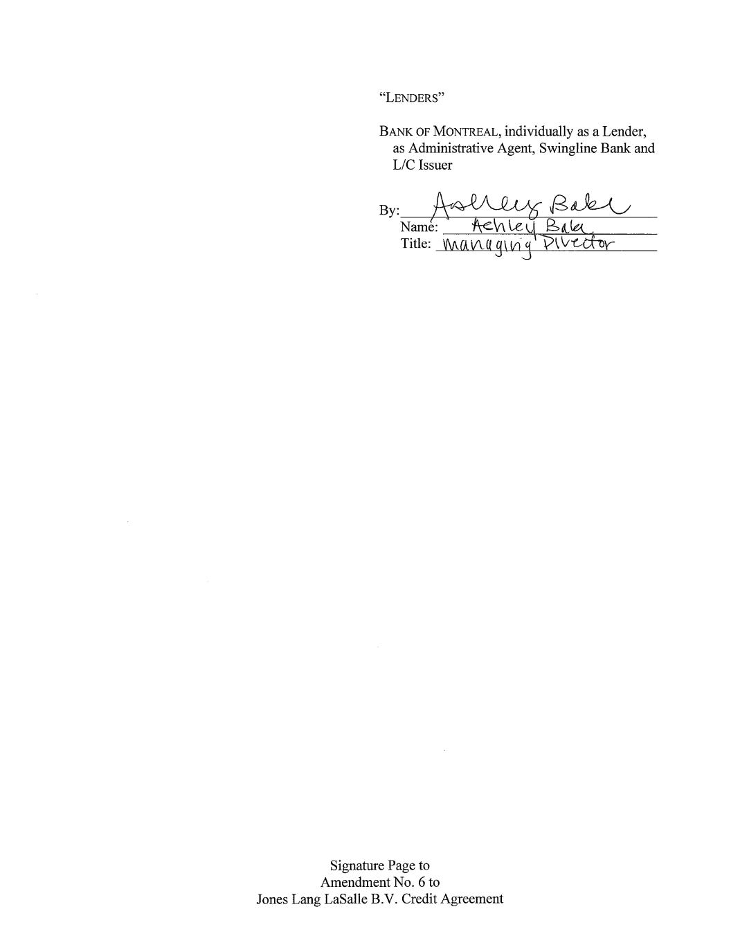 “LENDERS” BANK OF MONTREAL, individually as a Lender, as Administrative Agent, Swingline Bank and L/C Issuer py. paPiley Bue, Name: fAeWleg Bala. Title: WAavVt q\ lng Veer Signature Page to Amendment No. 6 to Jones Lang LaSalle B.V. Credit Agreement