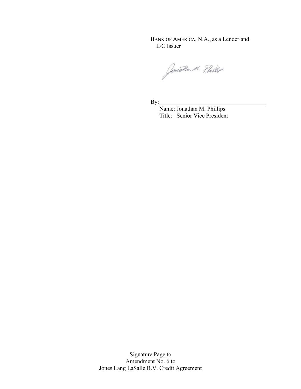 Signature Page to Amendment No. 6 to Jones Lang LaSalle B.V. Credit Agreement BANK OF AMERICA, N.A., as a Lender and L/C Issuer By: ____________________________________ Name: Jonathan M. Phillips Title: Senior Vice President