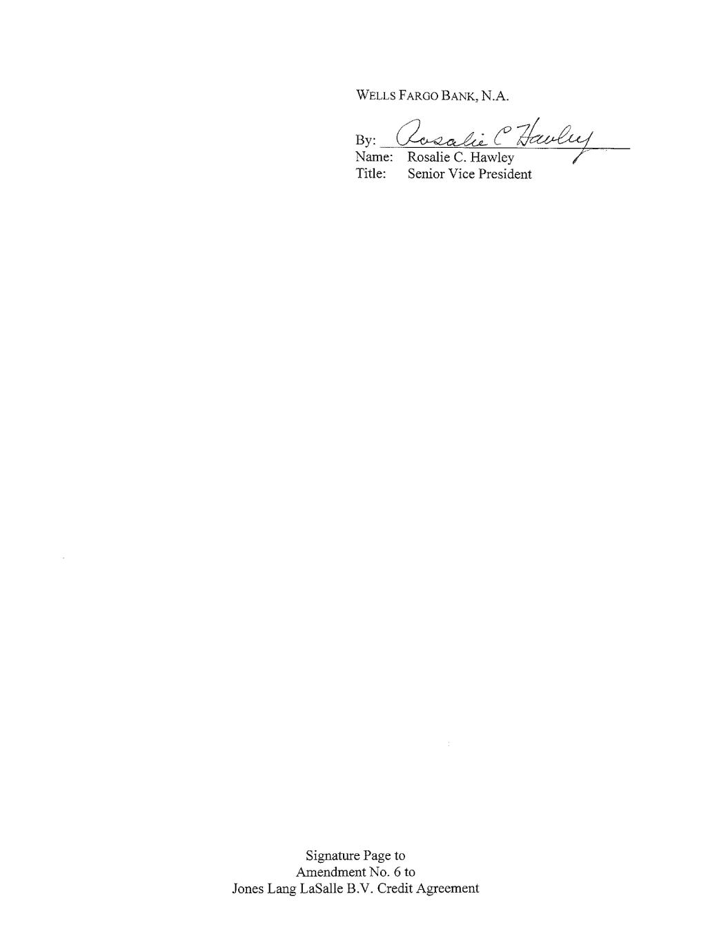 WELLS FARGO BANK, N.A. By: (Lea le: C Haslies 7 Name: Rosalie C. Hawley Title: Senior Vice President Signature Page to Amendment No. 6 to Jones Lang LaSalle B.V. Credit Agreement