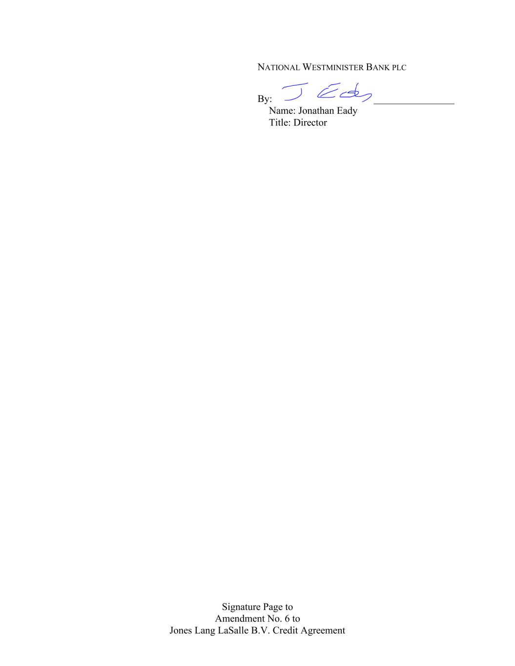 Signature Page to Amendment No. 6 to Jones Lang LaSalle B.V. Credit Agreement NATIONAL WESTMINISTER BANK PLC By: ________________ Name: Jonathan Eady Title: Director