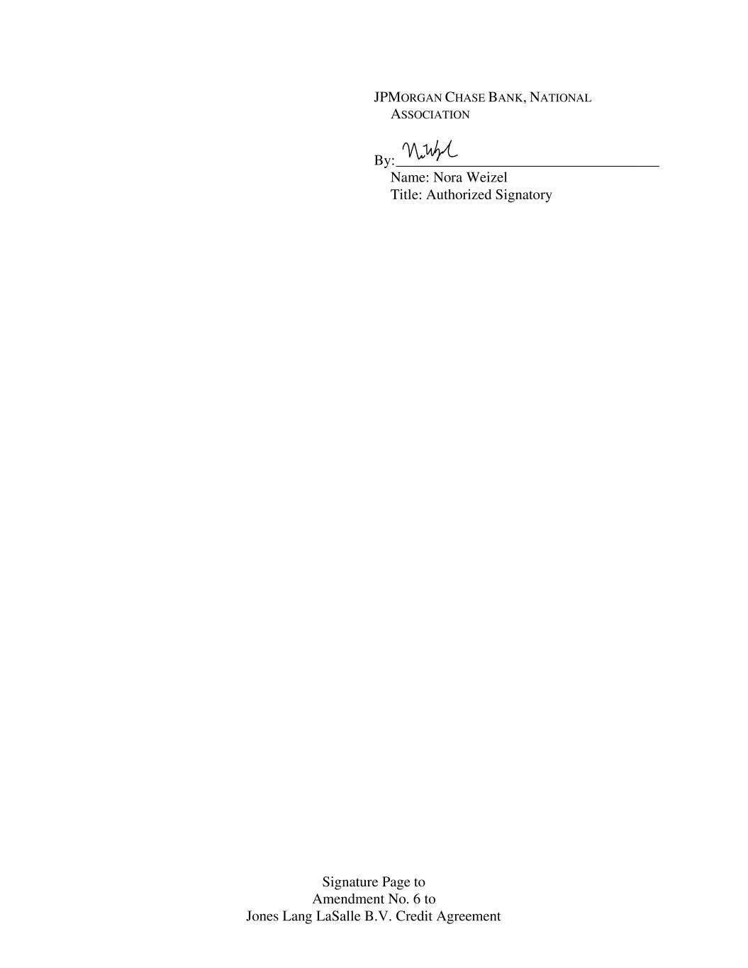 Signature Page to Amendment No. 6 to Jones Lang LaSalle B.V. Credit Agreement JPMORGAN CHASE BANK, NATIONAL ASSOCIATION By: ____________________________________ Name: Nora Weizel Title: Authorized Signatory
