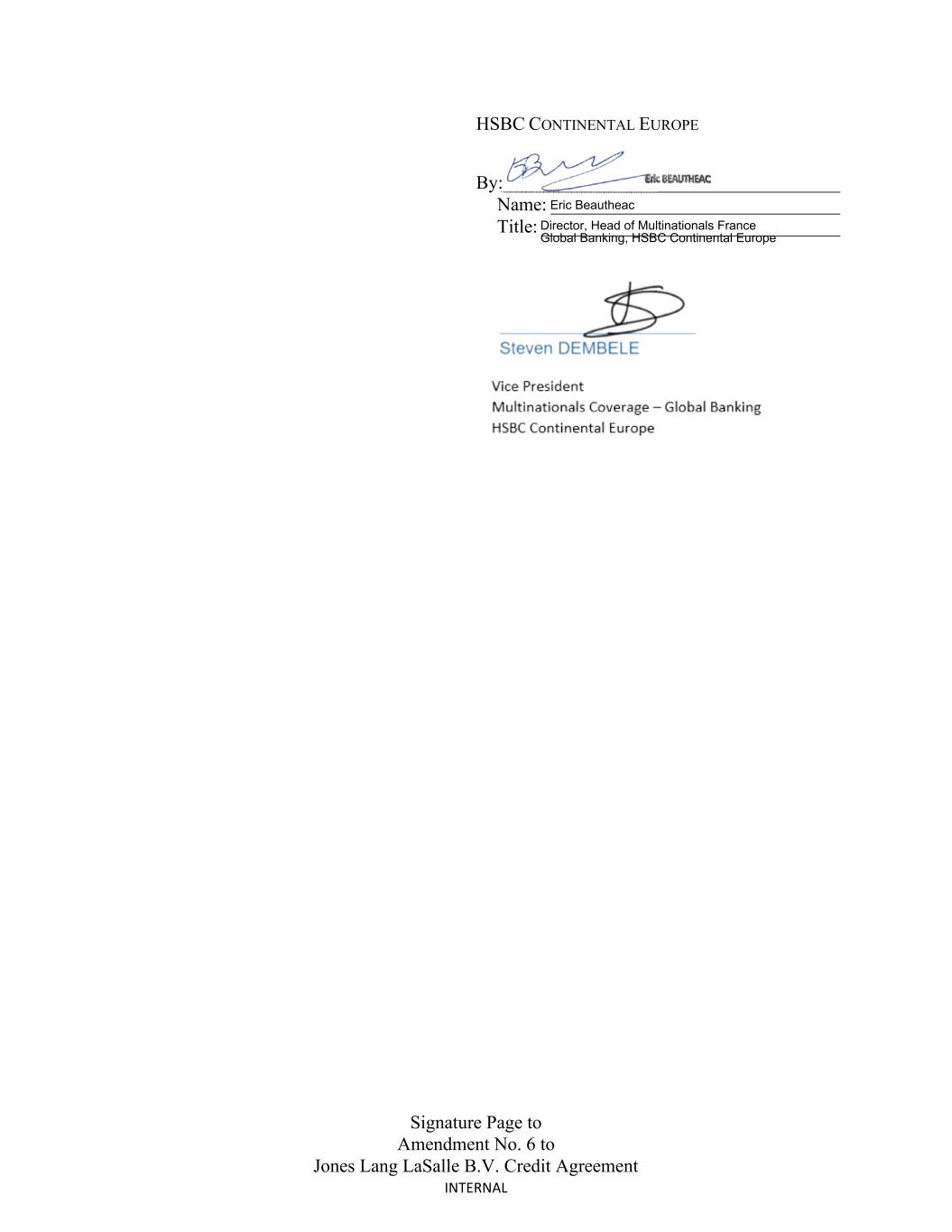 Signature Page to Amendment No. 6 to Jones Lang LaSalle B.V. Credit Agreement INTERNAL HSBC CONTINENTAL EUROPE By: ____________________________________ Name: _______________________________ Title: ________________________________ Director, Head of Multinationals France Global Banking, HSBC Continental Europe Eric Beautheac