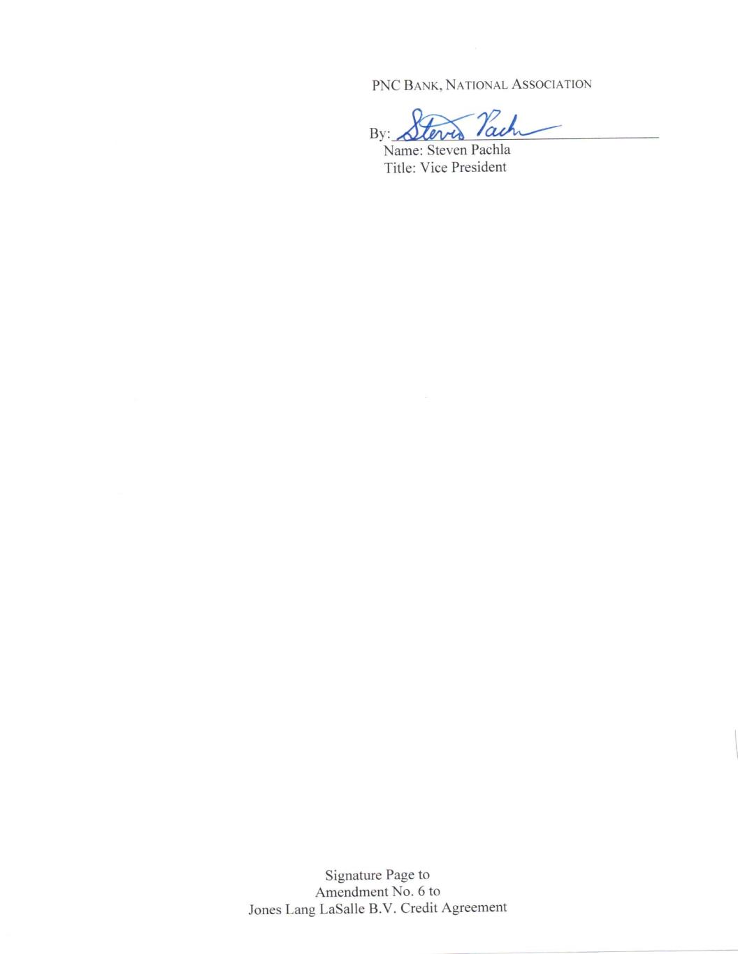 PNC BANK, NATIONAL ASSOCIATION by: Mba Mach — Name: Steven Pachla Title: Vice President Signature Page to Amendment No. 6 to Jones Lang LaSalle B.V. Credit Agreement