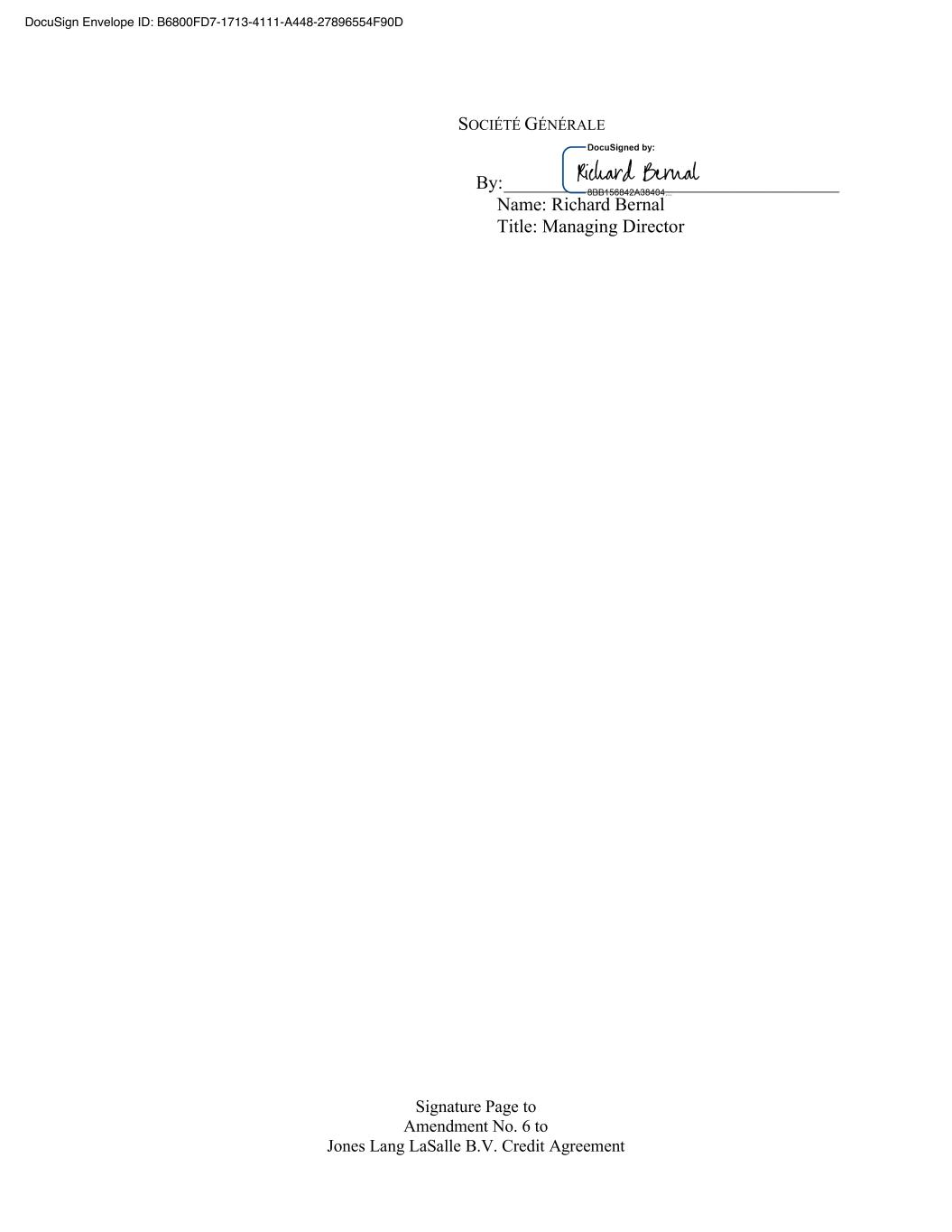 Signature Page to Amendment No. 6 to Jones Lang LaSalle B.V. Credit Agreement SOCIÉTÉ GÉNÉRALE By: ____________________________________ Name: Richard Bernal Title: Managing Director DocuSign Envelope ID: B6800FD7-1713-4111-A448-27896554F90D