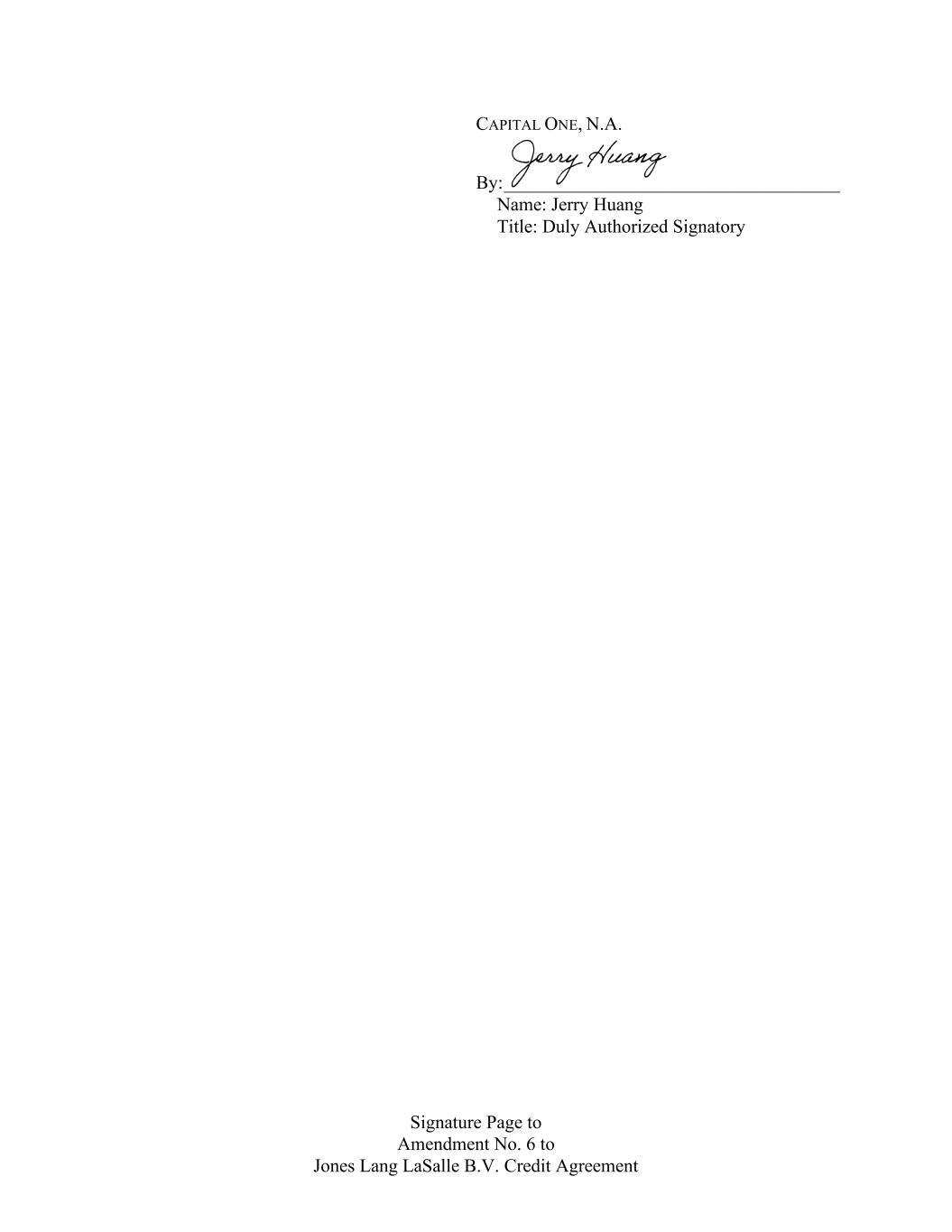 Signature Page to Amendment No. 6 to Jones Lang LaSalle B.V. Credit Agreement CAPITAL ONE, N.A. By: ____________________________________ Name: Jerry Huang Title: Duly Authorized Signatory