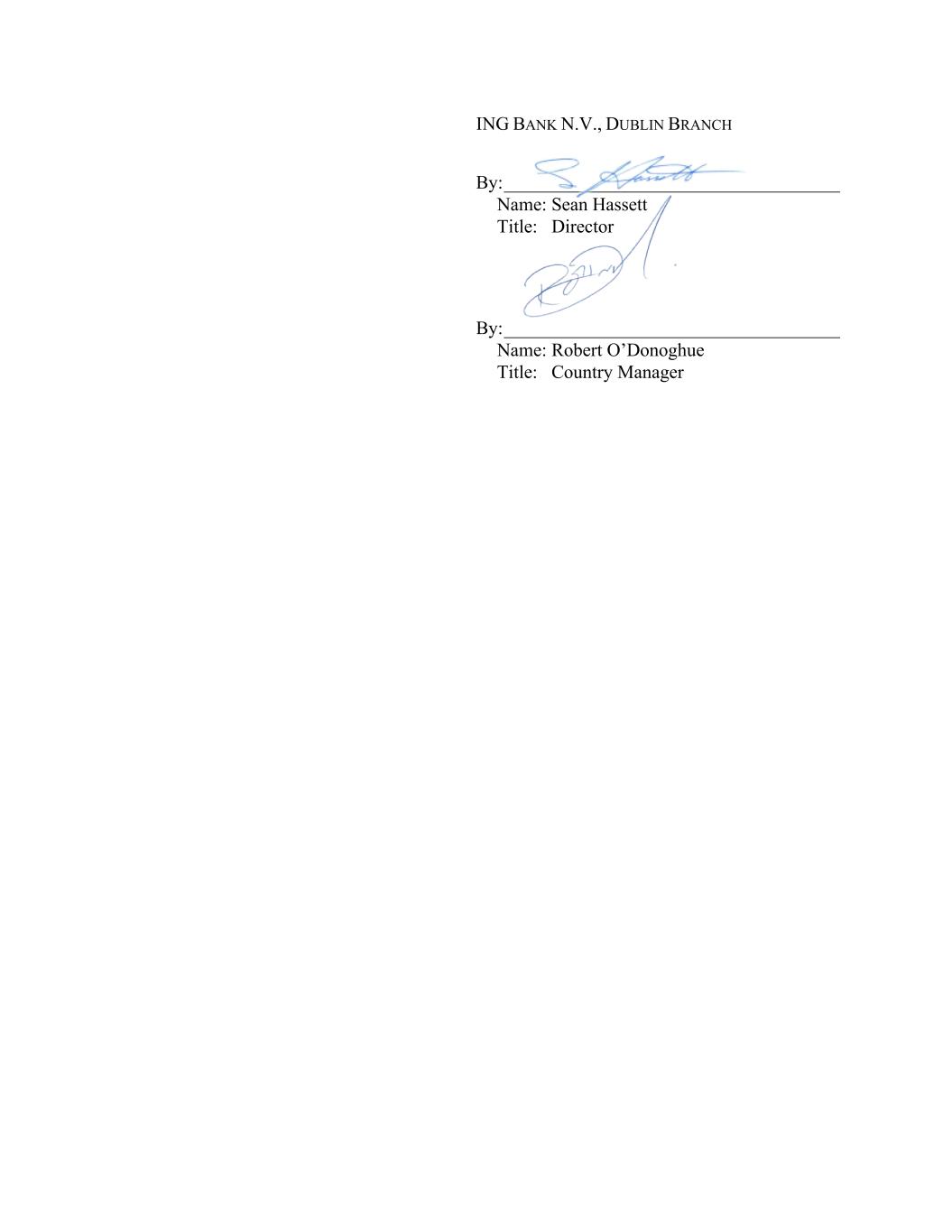 ING BANK N.V., DUBLIN BRANCH By: ____________________________________ Name: Sean Hassett Title: Director By: ____________________________________ Name: Robert O’Donoghue Title: Country Manager