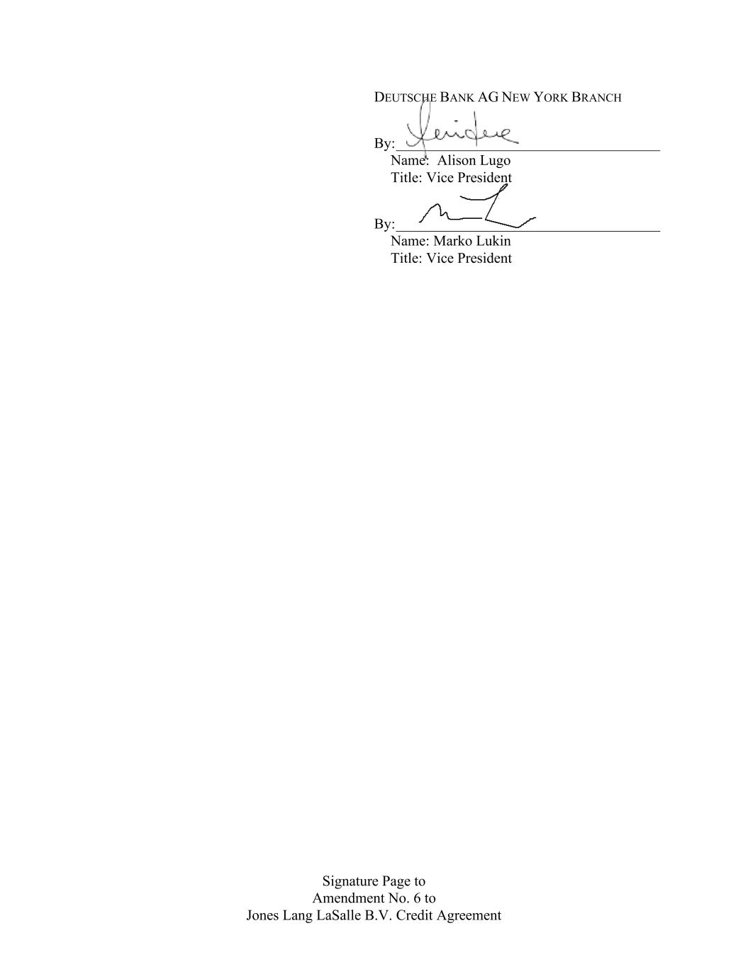 Signature Page to Amendment No. 6 to Jones Lang LaSalle B.V. Credit Agreement DEUTSCHE BANK AG NEW YORK BRANCH By: ____________________________________ Name: Alison Lugo Title: Vice President By: ____________________________________ Name: Marko Lukin Title: Vice President